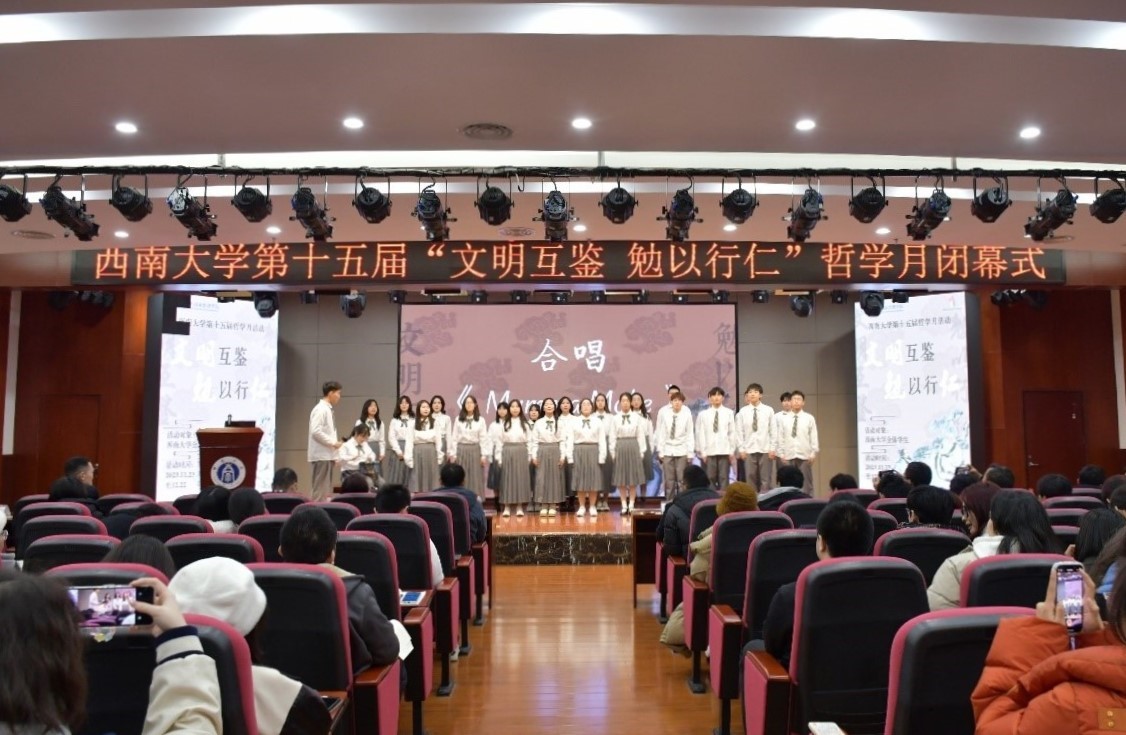 发布时间: 2023-12-25 17:15:16 已阅读:12月22日晚19:00,英国上市公司365第十五届“文明互鉴·勉以行仁”哲学月闭幕式在校博物馆4楼报告厅隆重举行。华南师范大学特聘教授肖显静、校社科处副处长王作军、学生处助学中心主任孙金春、博物馆副馆长谭志敏、国家治理学院副院长郭美云、张永红、何健以及全校师生200余人参加了闭幕式。