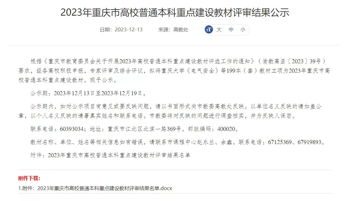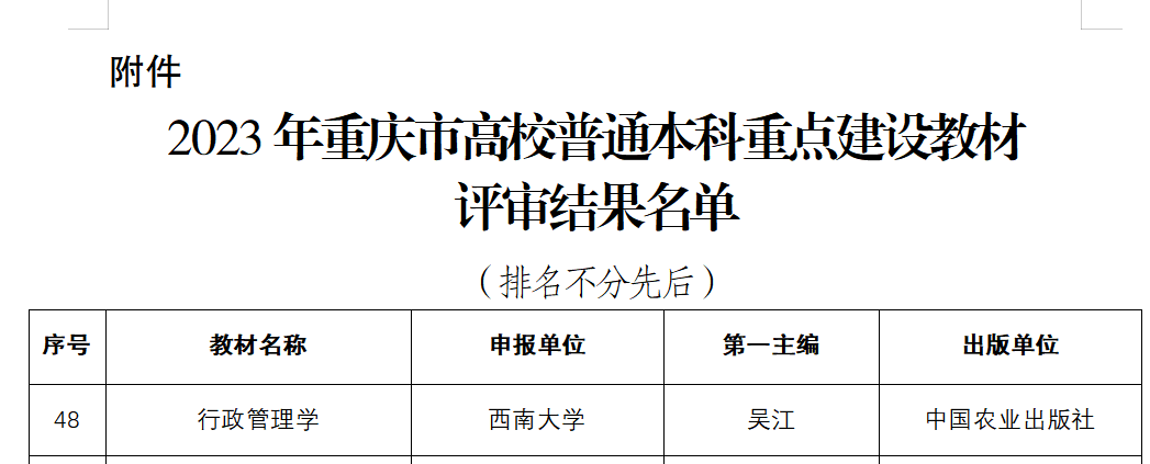 12月13日,重庆市教育委员会发布《2023年重庆市高校普通本科重点建设教材评审结果公示》,学院吴江教授主编的《行政管理学》教材获重庆市高校普通本科重点建设教材立项