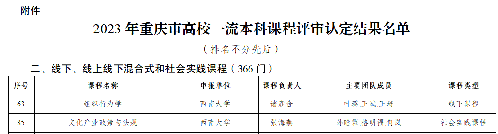 发布时间: 2023-11-03 14:31:45 已阅读:11月2日,重庆市教育委员会发布《2023年重庆市高校一流本科课程评审认定结果公示》,学院2门课程列入2023年重庆市高校一流本科课程认定名单。其中,《组织行为学》被认为重庆市高校一流本科课程线下课程,《文化产业政策与法规》被认定为重庆市高校一流本科课程社会实践课程。