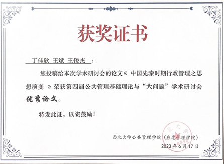 经专家学术评审,丁佳欣同学撰写的论文《中国先秦时期行政管理之思想演变》荣获第四届公共管理基础理论与“大问题”研讨会优秀论文奖。据悉,此次会议有60余篇论文入选研讨会交流,10篇论文获评优秀论文奖。