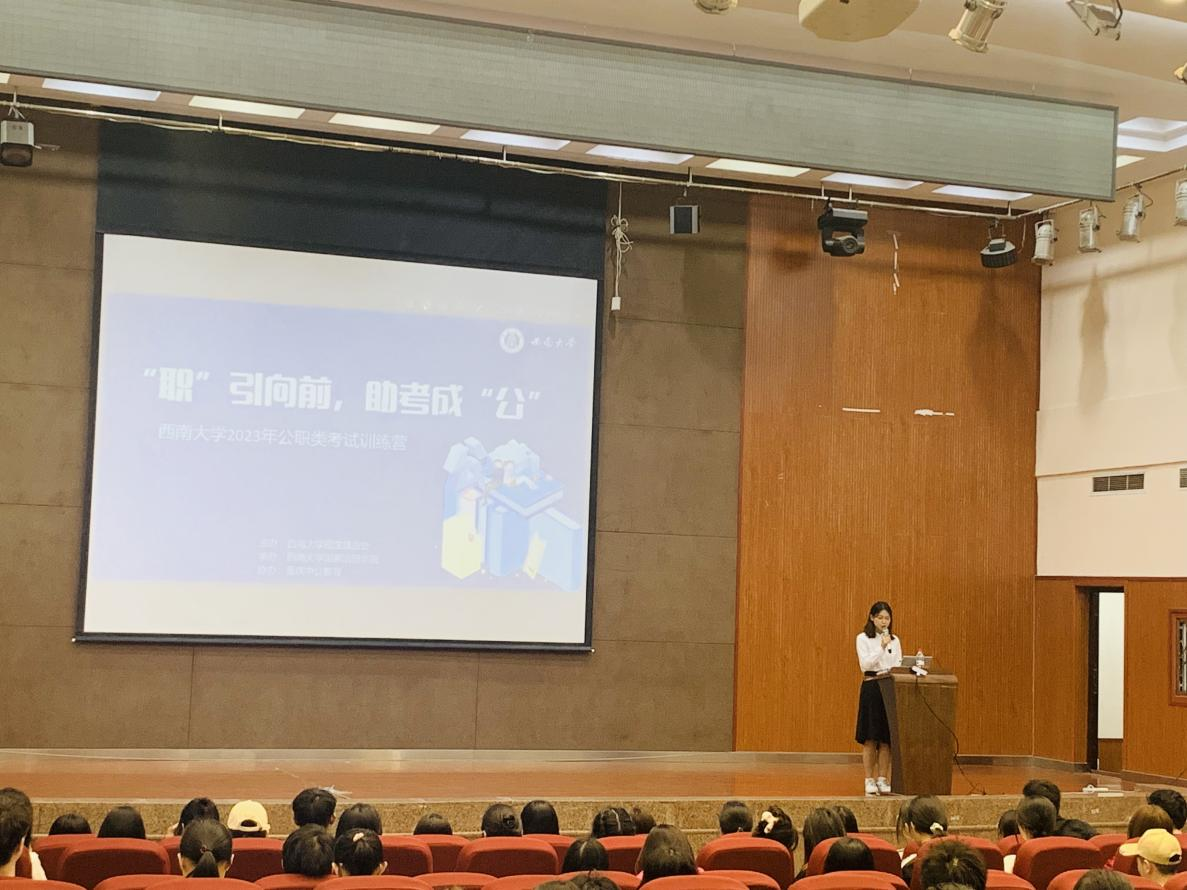 6月2日上午9:30,训练营的第一项活动公职就业大讲堂正式开启,学院党委副书记王晖,团委书记肖颜,辅导员曾琪芮、史丽、杨钦清出席活动,中公教育重庆研究院文科部教研室主任李广担纲主讲,全校300余名学生参加。