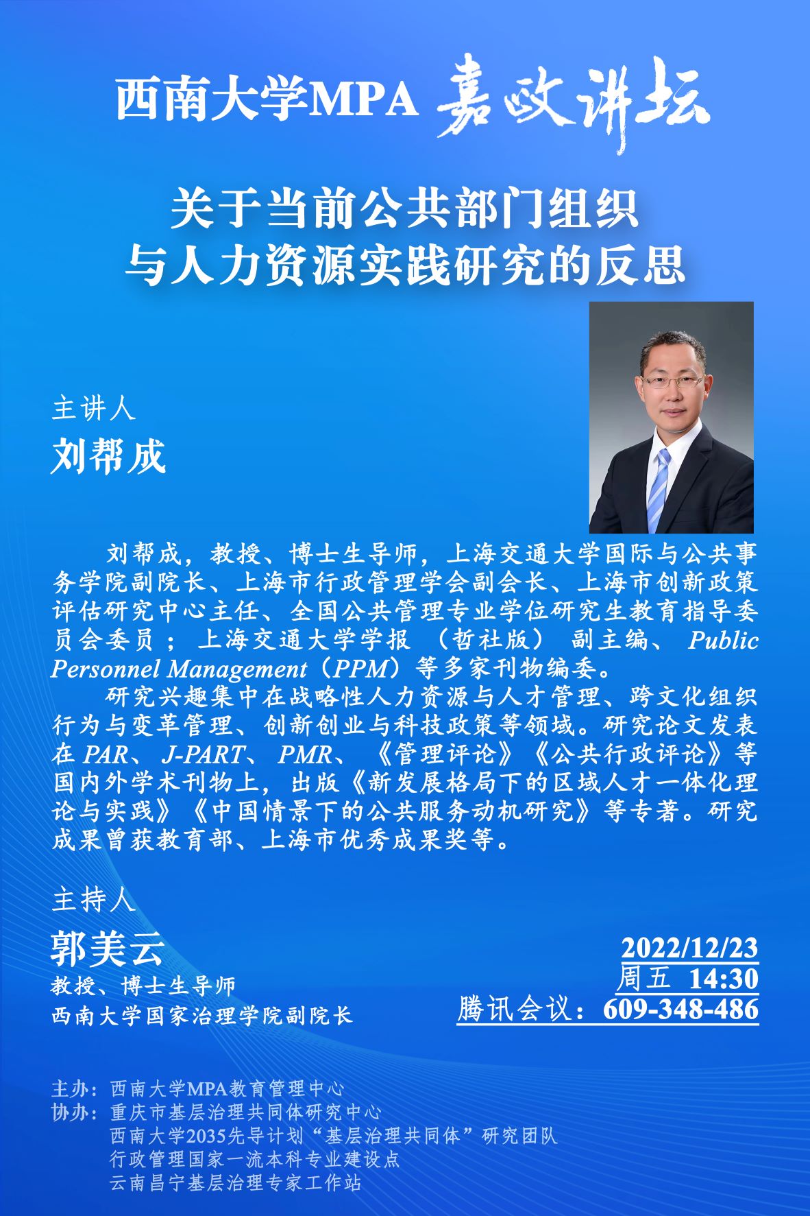 发布时间: 2022-12-26 12:08:31 已阅读:12月23日下午,由英国上市公司365MPA教育管理中心主办的“英国上市公司365MPA嘉政讲坛”第一期顺利举行,讲坛同时由重庆市基层治理共同体研究中心、英国上市公司3652035先导计划“基层治理共同体”研究团队、行政管理国家一流本科专业建设点、云南昌宁基层治理专家工作站联合协办。