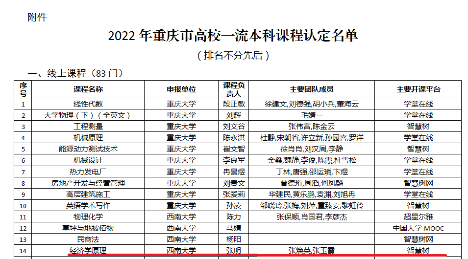 发布时间: 2022-12-29 18:32:55 已阅读:近日,重庆市教育委员会发布《关于公布2022年重庆市高校一流本科课程名单的通知》,学院《经济学原理》课程入选2022年重庆市高校一流本科课程线上课程认定名单。这是学院连续三年获得重庆市教育委员会认定的一流本科课程,学院通过稳步推进一流本科课程建设逐步夯实一流本科专业建设基础。
