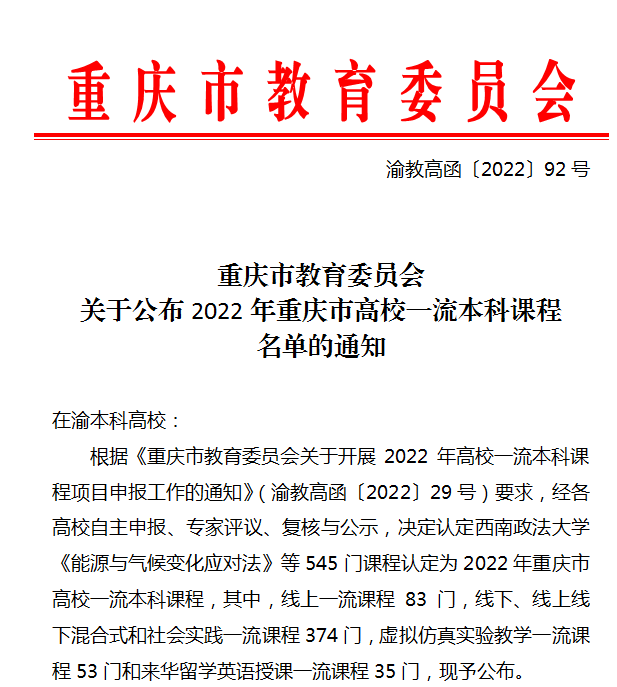 近日,重庆市教育委员会发布《关于公布2022年重庆市高校一流本科课程名单的通知》,学院《经济学原理》课程入选2022年重庆市高校一流本科课程线上课程认定名单。这是学院连续三年获得重庆市教育委员会认定的一流本科课程,学院通过稳步推进一流本科课程建设逐步夯实一流本科专业建设基础。