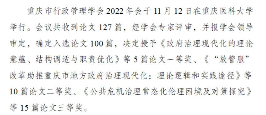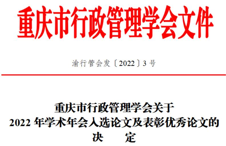 2022年12月17日,重庆市行政管理学会2022年年会暨“学习贯彻党的二十大精神 加快推进政府治理现代化”学术研讨会在线上举行。公共管理系教师、研究生和军转干部学员认真学习二十大报告精神,积极开展理论与实践研究,投稿12篇,其中行政管理专业研究生李文琢、重庆市基层治理共同体研究中心主任、英国上市公司365国家治理学院党委书记吴江教授撰写的《重庆市乡村振兴与新型城镇化协同发展:理论逻辑、现实困境与实践路径》获一等奖,李婧妍、王斌撰写的《“放管服”改革助推重庆市地方政府治理现代化:理论逻辑和实践路径》、军转干部学员方宇、王斌撰写的《困境与突破:城市社区应急管理体系的实践》获二等奖,李莹、吴江撰写的《成渝地区双城经济圈公共服务共建共享的难点与支点》、魏瑶瑶、公共管理系副主任张明教授撰写的《公共危机治理常态化伦理困境与对策研究》获三等奖。