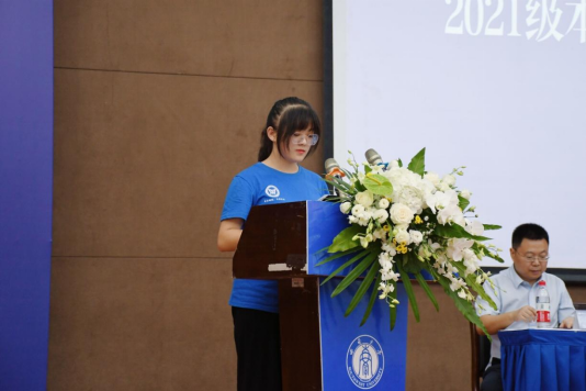 之后,新生代表2021级本科生贾同庆同学发言。她代表全体新同学对学院师长开学以来的友爱相助表示衷心地感谢,向大家描绘了自己的未来蓝图,希望能同所有的国治人一起,做到明德尚能,励志笃行;博采众长,兼容并蓄;德才兼备,砥行立名。