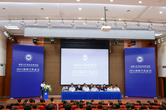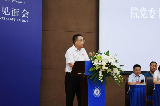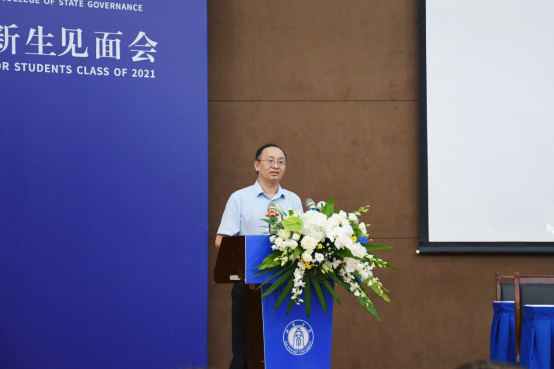 随后,院党委书记吴江教授讲话。他代表全院师生员工衷心地祝贺和欢迎全院324名新同学。吴江书记指出,今年,是中国共产党建党100周年,也是“十四五”规划开局之年,我们开启了全面建设社会主义现代化国家的新征程,向着第二个百年奋斗目标迈进。在这个重要的历史节点,学院全体新同学的青春时光恰好与国家的第二个百年梦想编织在一起,与学校“双一流”建设之梦,与学院的新文科交叉融合奋进之梦汇聚在一起。对此,他向同学们提出三点期望:一是心有所信,肩负“国家”使命。心中有信仰,就是要坚定对马克思主义的信仰,对中国特色社会主义的信念。肩上有担当,就是要肩负起中华民族伟大复兴的光荣使命,努力学习,积极探索,勇做走在时代前列的劳动者、奋斗者、奉献者,成长为中国的“脊梁”。二是潜心学习,锤炼“治理”本领。“不积跬步无以至千里,不积小流无以成江海”。只有坚持潜心学习、善于思考,专于研究,才能练就发现问题、探索问题、解决问题的能力,成为堪当国家重任的复合型人才,为实现家国理想奠定坚实基础。三是躬耕实践,涵养“人民”情怀。作为一名国治人,我们定要要胸怀“国之大者”,从高处着眼,从小处着手,到农村、到乡镇、到社区,积极参加社会实践,用行动助力乡村振兴和城乡融合发展,在实践中不断涵养“人民”情怀。
