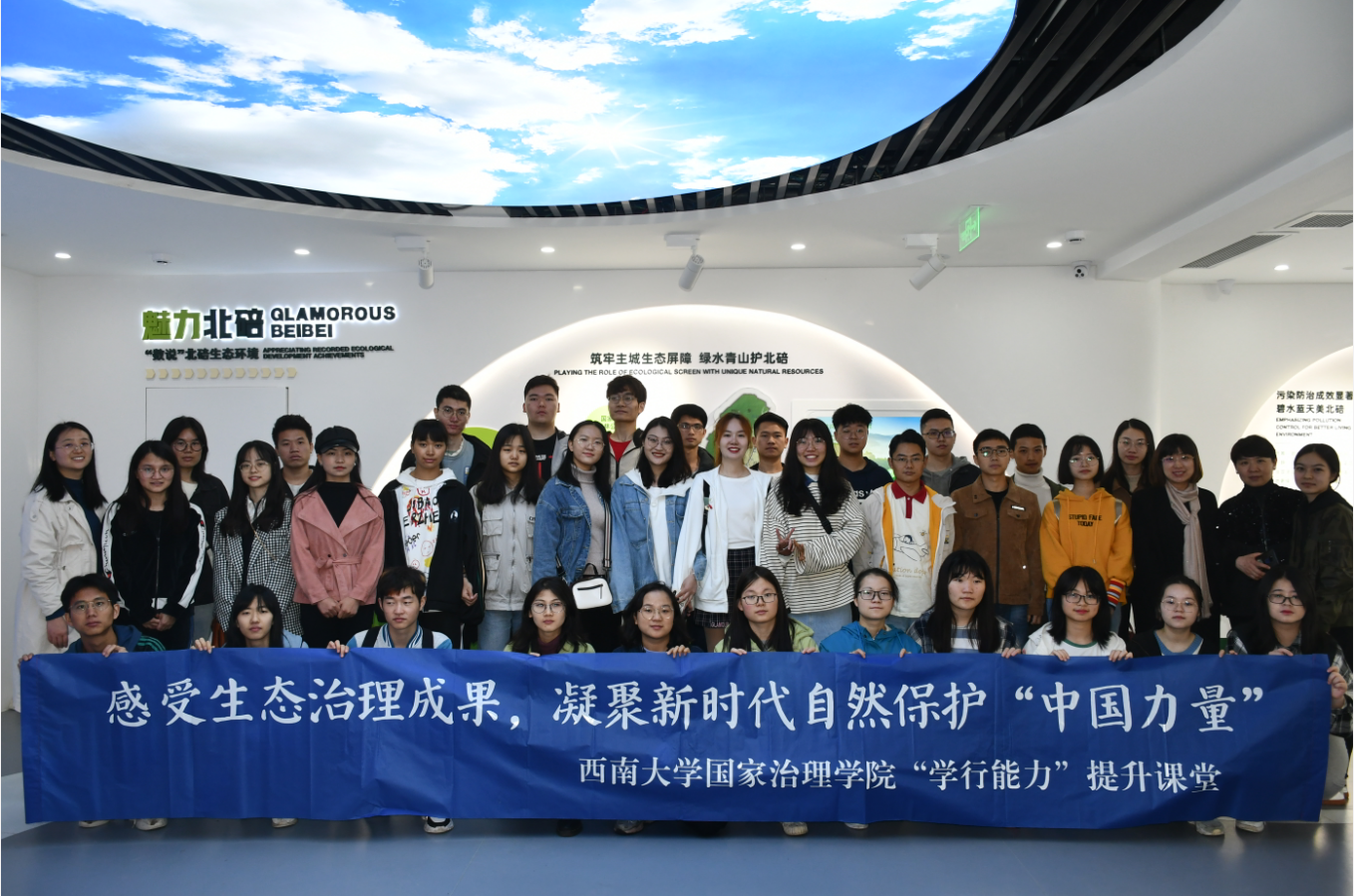 “绿水青山就是金山银山”,直观可见的数字化图像数据、生动的模型展览、高清VR体验以及人性化的拍照打卡服务,无处不体现着我国的生态文明治理体系和治理能力现代化已明显提升。同学们在意犹未尽中结束了学习参观之旅,纷纷感叹于党的十八大以来国家在推进生态文明建设和美丽中国建设上所取得的突出成就,纷纷表示将承载起国家和民族未来发展的希望,自觉担当起“建设美丽中国”、实现“中国梦”的新时代使命。
