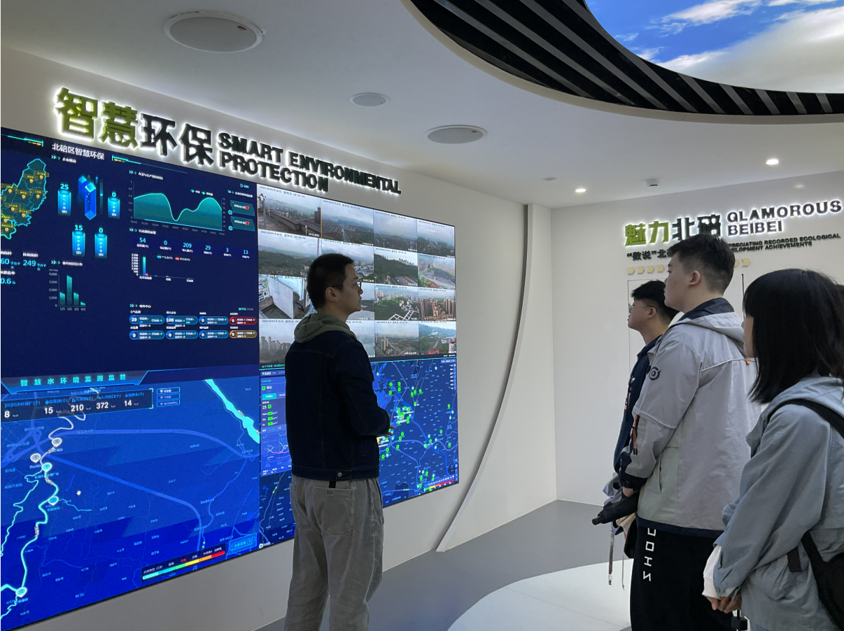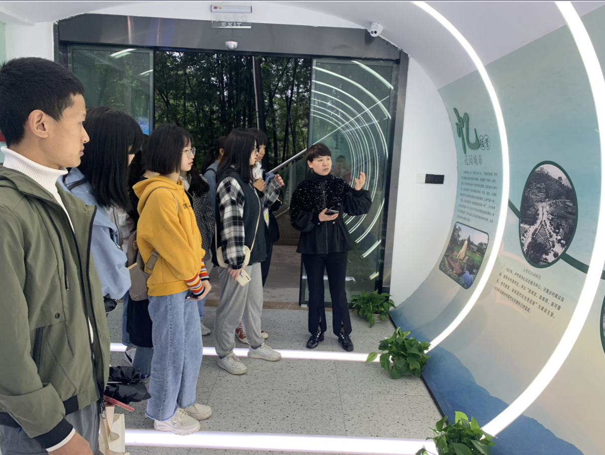 学习活动的第二站是北碚区新时代文明实践生态文明分中心。生态文明分中心位于缙云山翠月湖畔,建设面积300多平方米,是缙云山综合整治和生态文明示范区创建的重要成果,也是全国第一个建成投用的新时代生态文明实践中心。走进中心,第一眼就看到了习近平总书记的绿色文明思想:“生态兴则文明兴,生态衰则文明衰”。展览分为8个部分,分别从生态北碚、绿色北碚、魅力北碚、洁净北碚、文明北碚、智慧环保等方面展示了生态治理成效。在VR体验区,同学们戴上VR眼镜,饶有兴致地观看了北碚区重要生态建设成效的全景图,深刻感受到了科技与生态治理的完美结合。在环幕电影放映区,同学们集中观看了《污染防治攻坚和绿色促发展》主题片,宣传片通过缙云山整治前后的对比生动展现了缙云山生态环境的整治成果。在工作人员的带领下,师生还参观了绿色生活体验区和“垃圾,是放错地方的资源”生态艺术展。现代化的建筑设计风格、融合前沿科技的现代家居、天马行空变废为宝的艺术品与缙云山的自然风景互相映衬、相互交融,体现着人与自然和谐共生的生态理念。