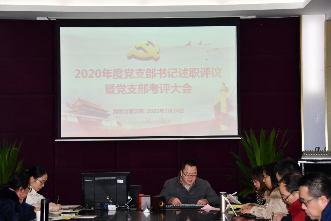 发布时间: 2021-01-21 15:44:18 已阅读:为加强党的全面领导,进一步推动全面从严治党向纵深发展,2021年1月14日14:30,国家治理学院于三教3201会议室召开2020年度党支部书记述职评议暨党支部考评大会。全体党委委员、纪委委员、党支部书记、部分党员及群众代表参会,法学院专职组织员唐静列席会议。会议由学院党委书记吴江主持。