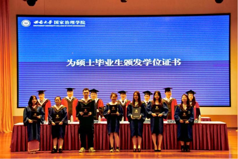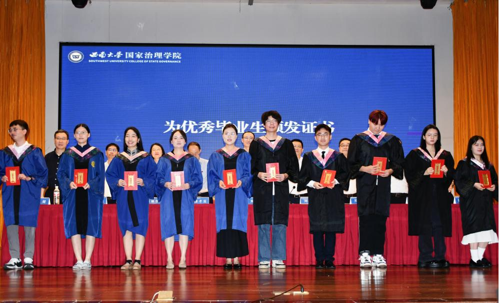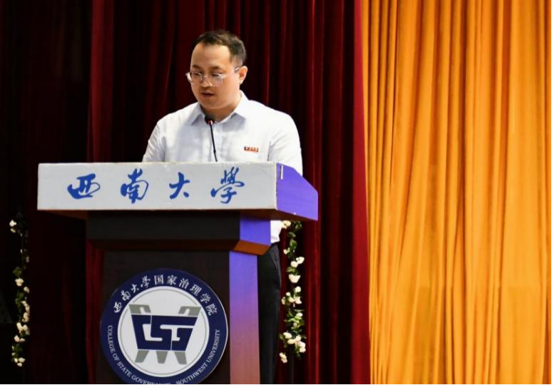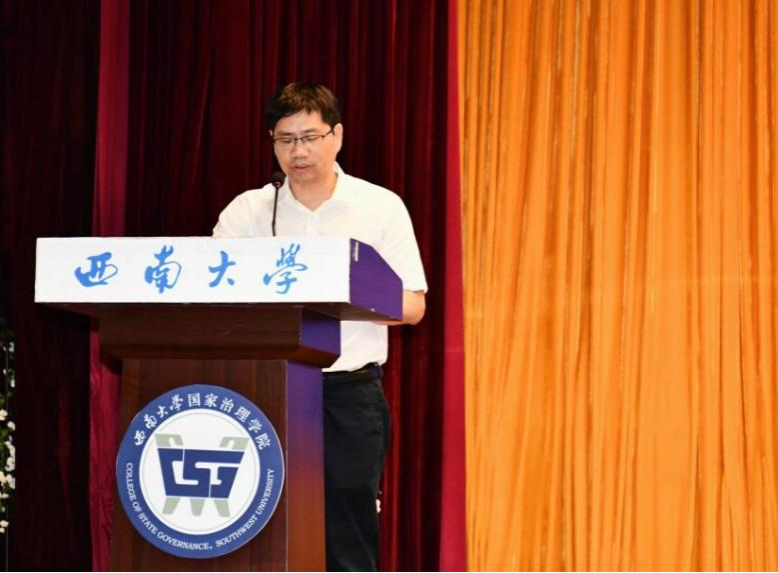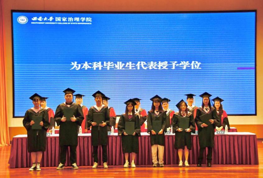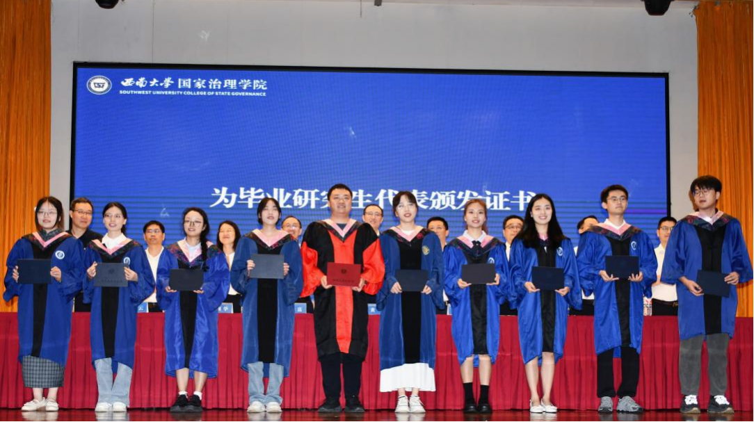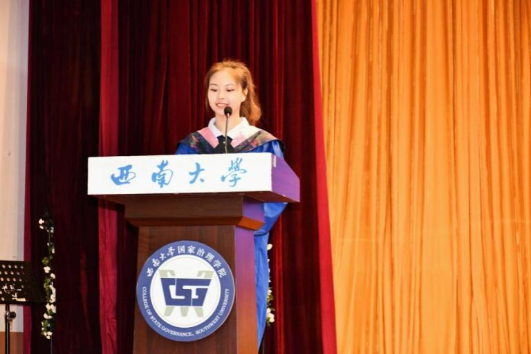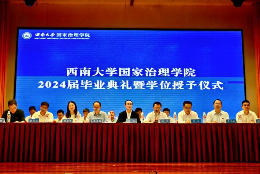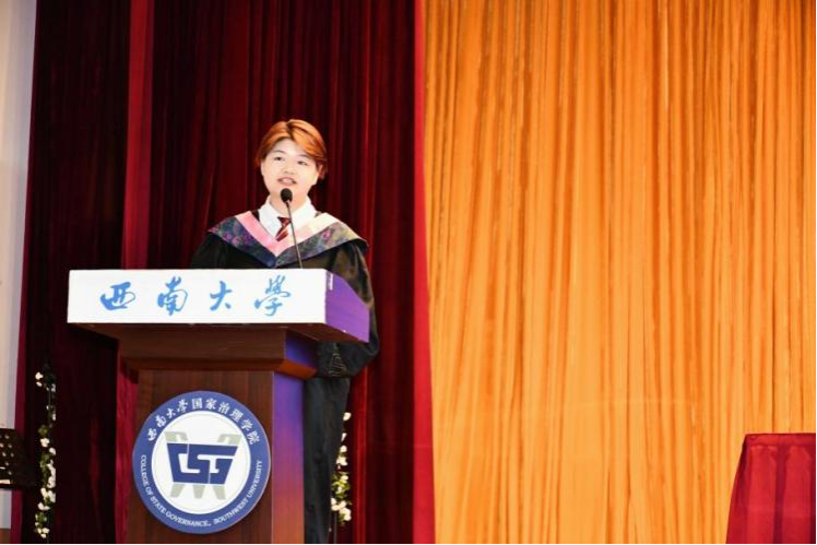 毕业研究生代表黄秘回顾了七年西大记忆,分享了初心沉淀与成长淬炼两个故事。希望大家不忘来时路,方知向何生,不罔肩头担,永远跟党走。本科毕业生代表李泳辰在发言中回忆到在四年前成为国家治理学院第一届学生,在过去四年与时代同行、与学院共进、与青春共舞,祝愿每一位毕业生这不平凡的路上不辍不休。教师代表何健寄语毕业生们在未来始终将校训“含弘光大,继往开来”,院训“善治明理,弘毅修远”内化于心,外化于行,不仅记得在西大的拼搏,还须记得在西大收获的各种美好。祝愿毕业生们未来一路凯歌,归来仍是少年!
