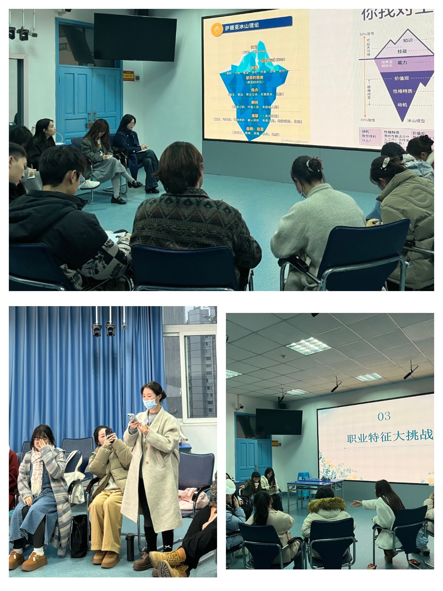 第一期小组活动中,汪老师借助一系列趣味小游戏促进了小组成员间的相互了解,在轻松愉悦的环境中消除成员初次见面的紧张感,初步形成融洽的小组氛围。通过“守护天使”建立小组成员微型互助小组,在第一期活动尾声,小组成员共同制定小组规则。在主题为“认识自我”在第二期小组活动中,汪老师通过冰山演绎引导小组成员深入探索自我,明确价值导向,挖掘内在潜能,设置“优点大轰炸”环节,小组成员发现并分享各自的优点,从而学会在求职面试中如何自信展示自我。第三期小组活动聚焦求职面试技巧,汪老师组织了无领导小组面试,通过建塔游戏情景设置,让小组成员体验真实的面试情景,引导小组成员学会适应压力,保持自信。最后,通过职业探索环节,将“日常生活”与“工作场景”结合到一起,从而明确职业目标。