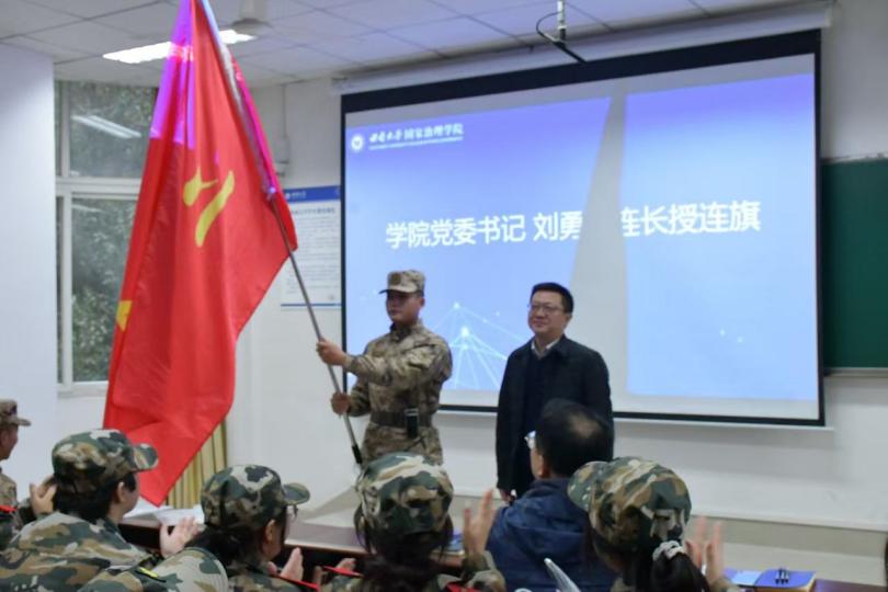 接下来,学院党委书记刘勇向连长曹海川授连旗。