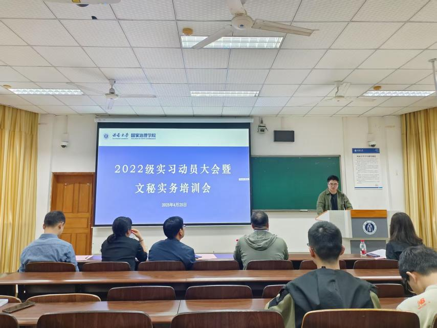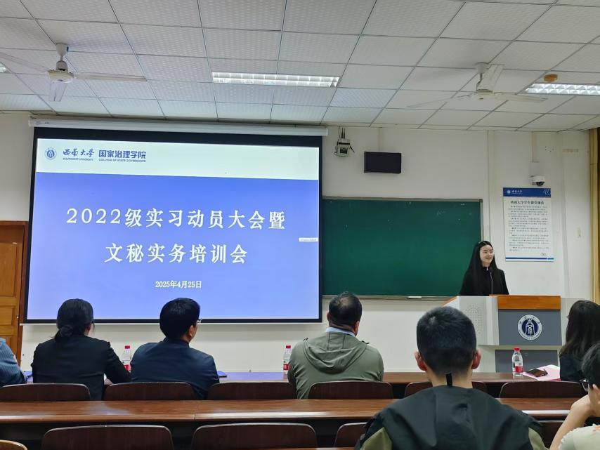发布时间: 2025-04-30 09:39:38 已阅读:为进一步提升学生综合素养,强化学生职场适应能力,4月25日14:30,学院本科2022级于28教105教室开展了实习动员大会暨“如何做好文秘工作”实习前实务培训会。大会特邀重庆市北碚区天生街道党工委书记王加维、英国上市公司365教师教学发展中心主任田晓伟、国家治理学院副院长(主持工作)郭美云等嘉宾出席,2022级全体本科生参加会议。会议由学院党委副书记陈丽华主持。