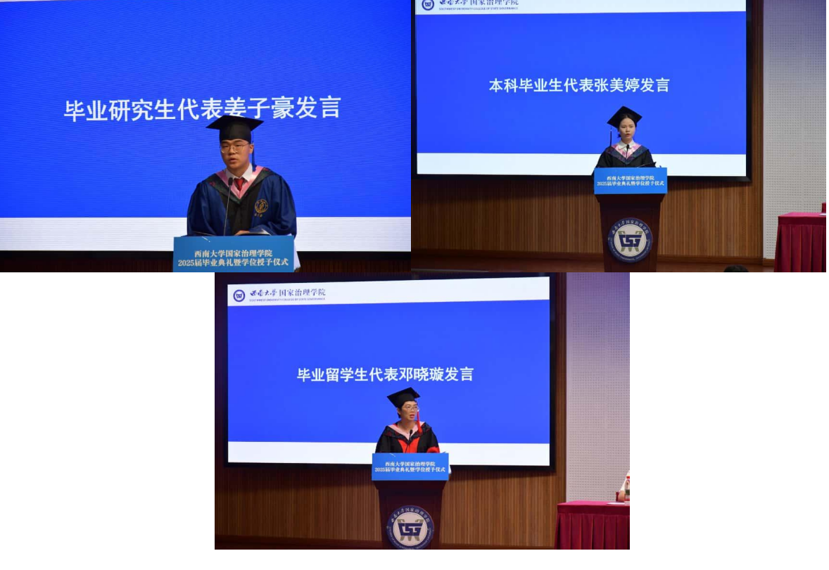 社会工作专业硕士毕业生姜子豪、哲学专业本科毕业生张美婷、来华留学博士毕业生邓晓璇作为2025届毕业生代表发言。姜子豪回顾了自己在学院求学时的三重“温度”,愿毕业生们做真诚、善良、有理想的人。张美婷讲述了自己在哲学专业善思明理、参赛获奖、保研深造的求学历程,感恩老师的悉心教诲,号召同学们以哲学之思求真理,以破局之勇向前行。邓晓璇深情回忆了在学期间遇良师、交挚友、致大道的求学历程,呼吁同学们在未来学习工作中发挥专业力量致力于关心和改善人类公共问题。