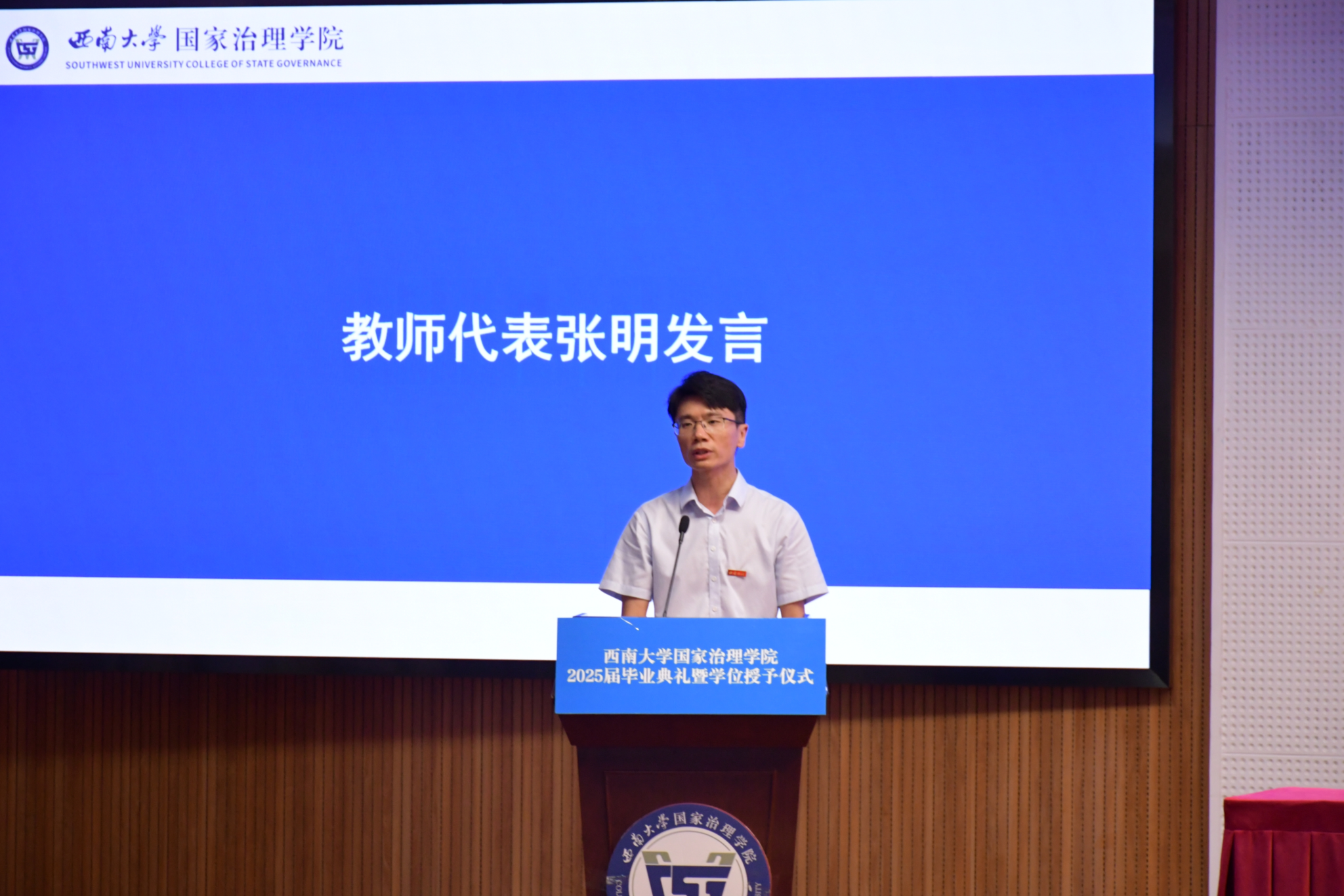 教师代表张明结合学院人才培养理念和时代发展背景,勉励毕业生们在大变局中有走正路的志气,走长路的勇气和走新路的锐气。