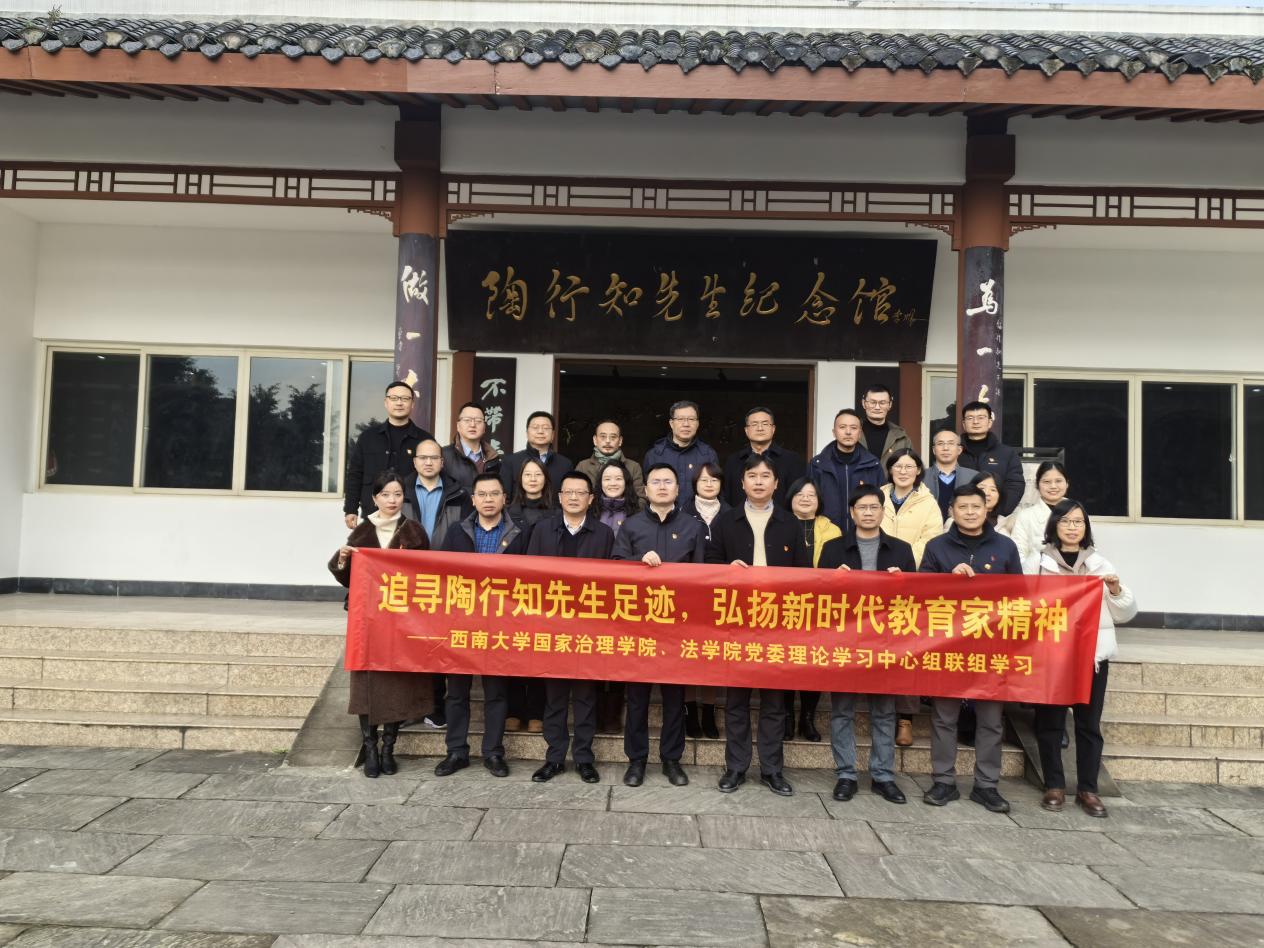 发布时间: 2026-01-05 16:46:23 已阅读:为深入学习贯彻党的教育方针,弘扬新时代教育家精神,1月4日,国家治理学院党委与法学院党委理论学习中心组联合组织领导班子成员及两委委员,赴陶行知先生纪念馆开展主题为“追寻陶行知先生足迹,弘扬新时代教育家精神”的联组学习活动。校党委委员、实验室建设与设备管理处处长卢坤到会指导。