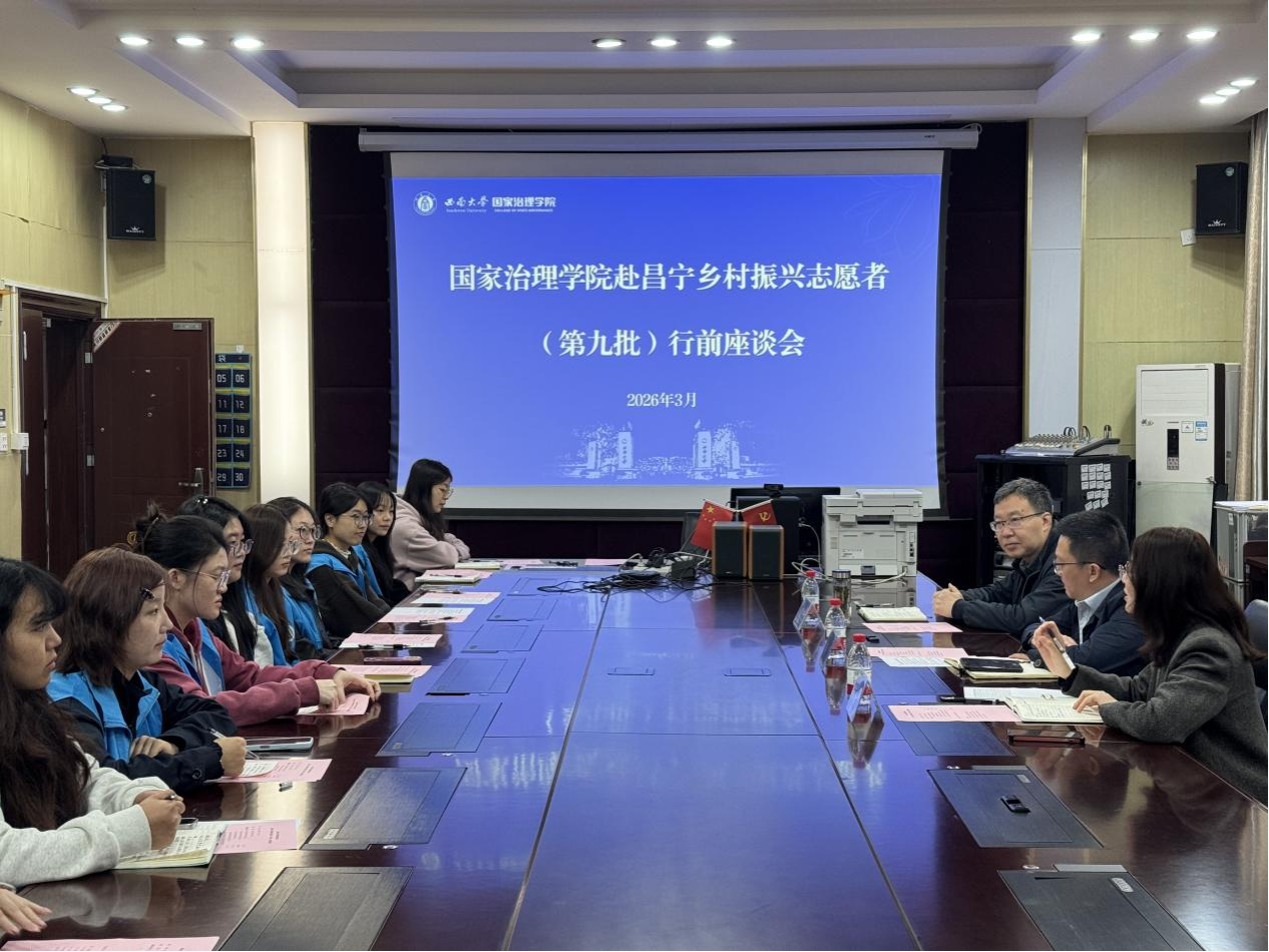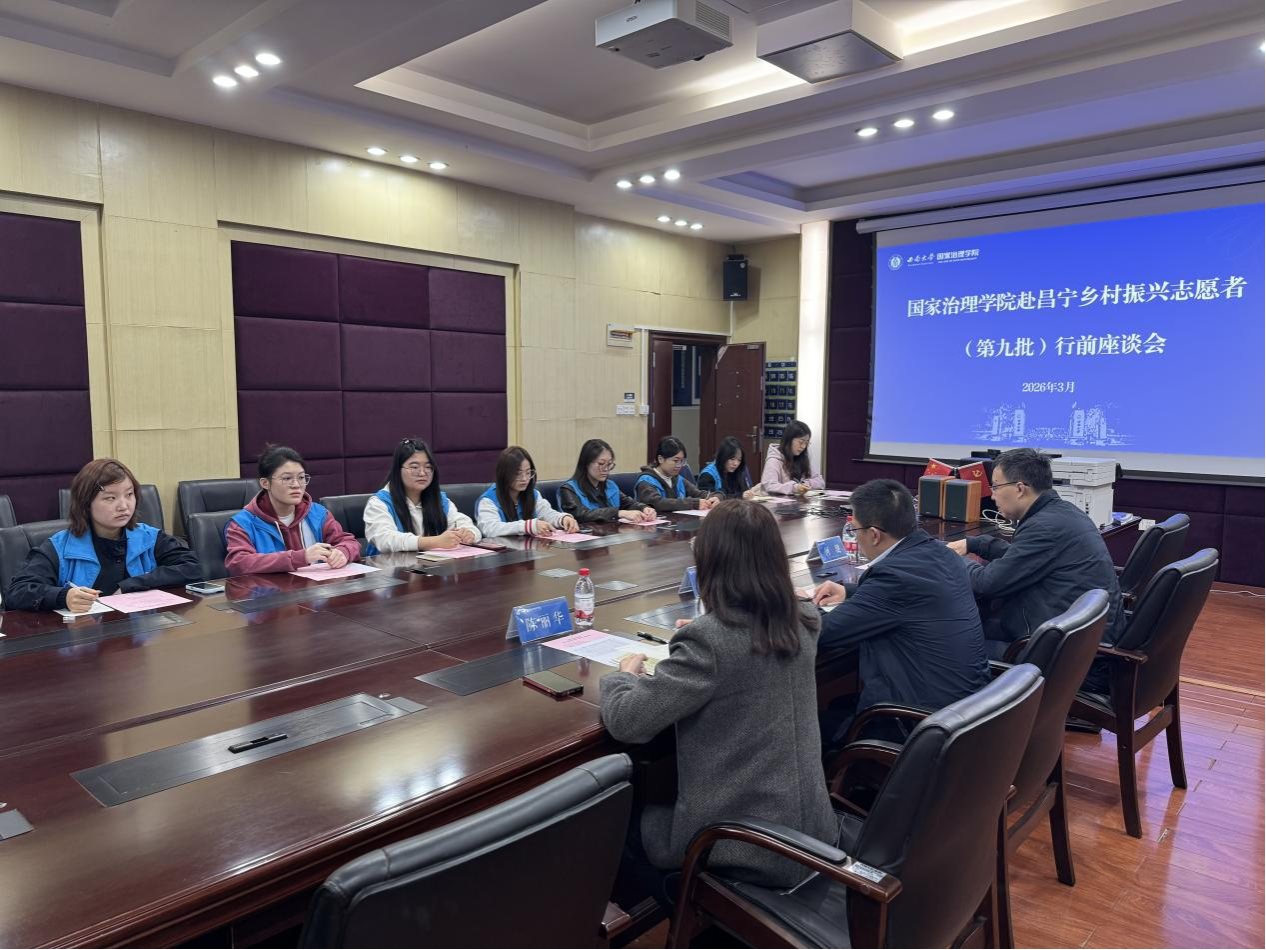 发布时间: 2026-03-09 15:12:44 已阅读:为深入贯彻落实习近平总书记关于青年工作的重要思想,锚定《乡村全面振兴规划(2024—2027年)》擎画的宏伟蓝图,3月6日上午,国家治理学院第九批赴昌宁乡村振兴研究生志愿服务团出征座谈会在3201会议室举行。学院党委书记刘勇、党委副书记陈丽华、副院长何健、研究生辅导员郝汉、第八批昌宁志愿服务团学生代表以及第九批昌宁志愿服务团成员参加了座谈会,会议由陈丽华主持。