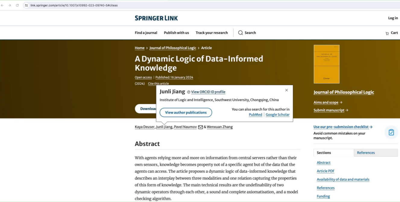新著新论|学院蒋军利老师合作新作刊发在中科院Top期刊《Journal of Philosophical Logic》