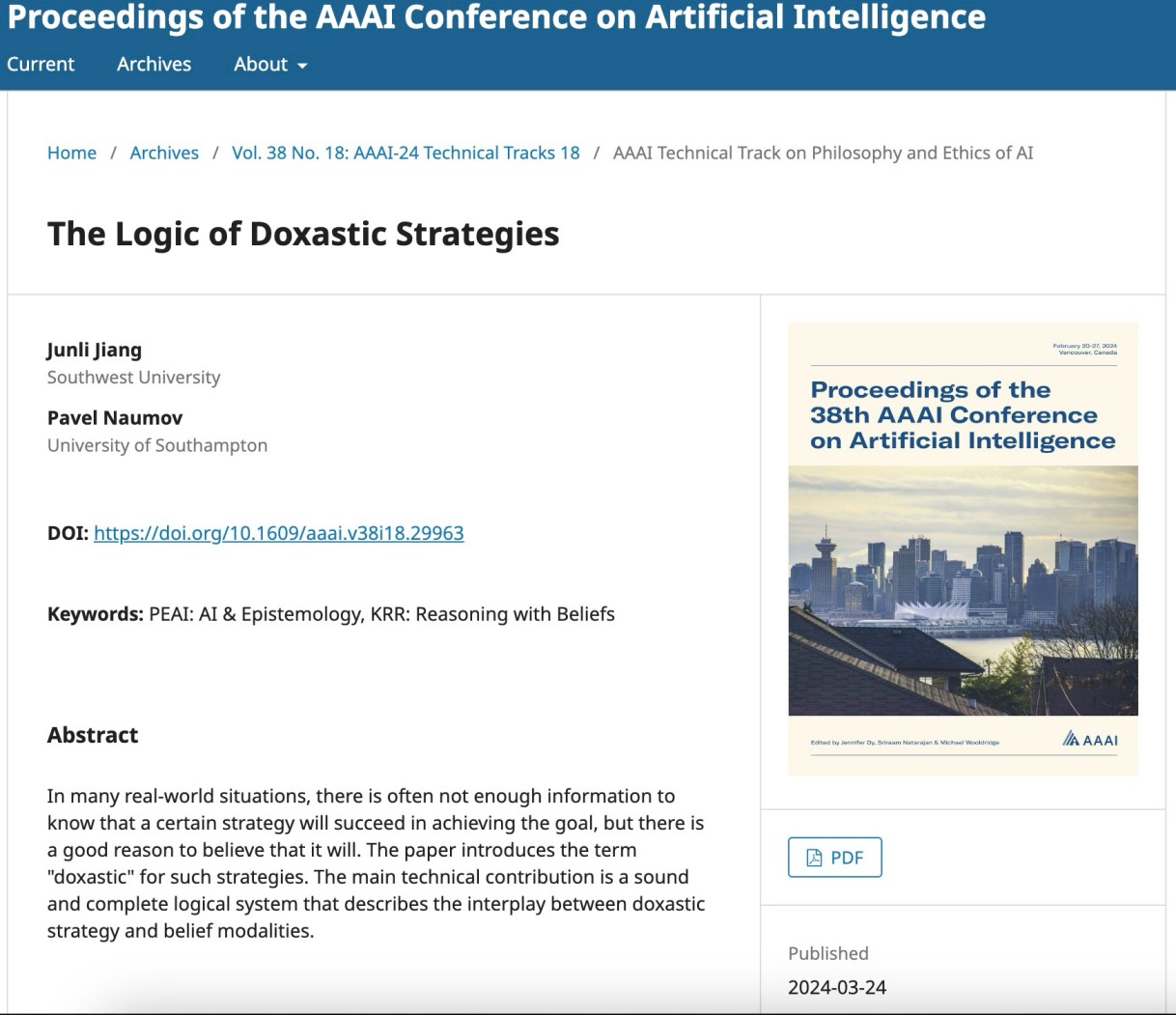 我院蒋军利老师合作撰写的论文《The Logic of Doxastic Strategies》入选国际人工智能顶级会议AAAI-24(Association for the Advance of Artificial Intelligence),近日论文已在线发表(https://doi.org/10.1609/aaai.v38i18.29963)。针对在许多现实情况下,通常没有足够的信息来知道某种策略是否会成功地实现目标,但有充分的理由相信它会成功。文章引入了术语“信念”来描述这种策略。主要技术贡献是给出了一个可靠且完全的逻辑系统,描述了信念策略和信念模式之间的相互作用。