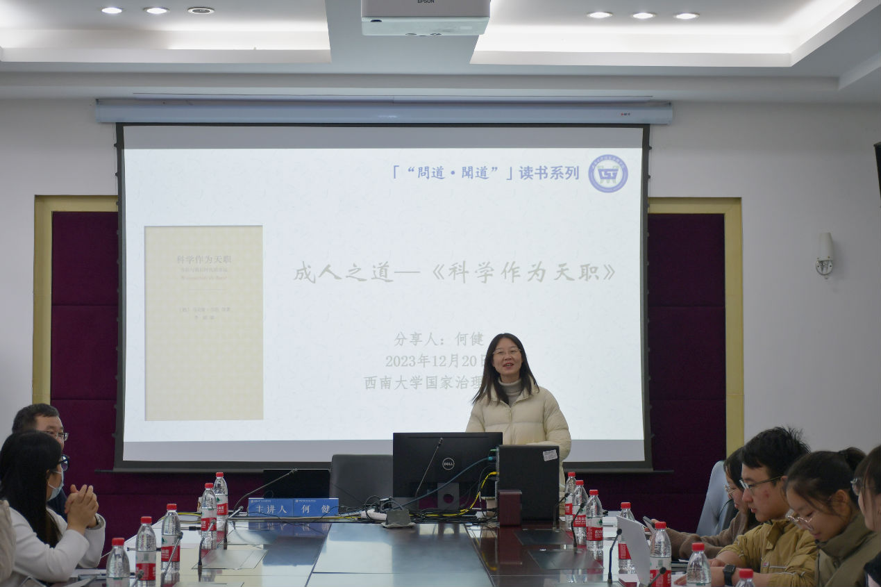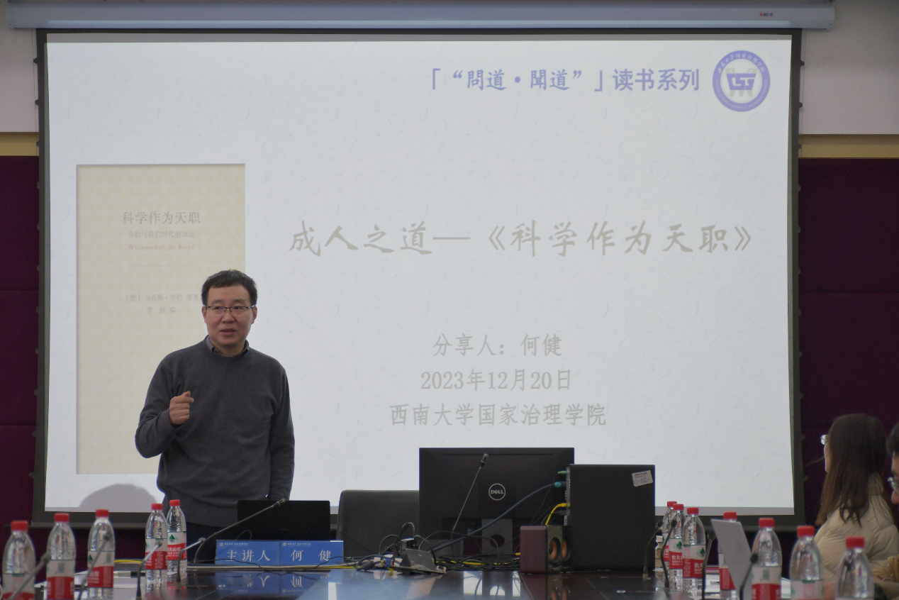 发布时间: 2023-12-22 11:07:04 已阅读:12月20日下午,由国家治理学院研究生会主办的“问道·闻道”读书系列研读会第一期在绩镛楼3328会议室顺利举行,主题为“成人之道——《科学作为天职》研读会”。本次研读会邀请学院副院长何健教授进行分享,研读会由学院党委副书记陈丽华老师主持。