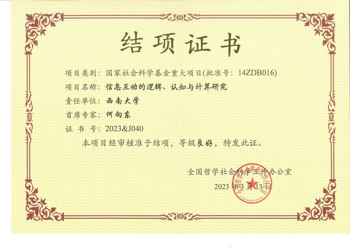 2023年3月,我院何向东教授主持的国家社科基金重大项目“信息互动的逻辑、认知与计算研究” (14ZDB016)顺利通过全国哲学社会科学规划办的结题验收,鉴定结论为“良好”,结项证书编号为2023&J040。项目的子课题负责人包括郭美云教授、陈武教授、雷旭教授和邓辉文教授。