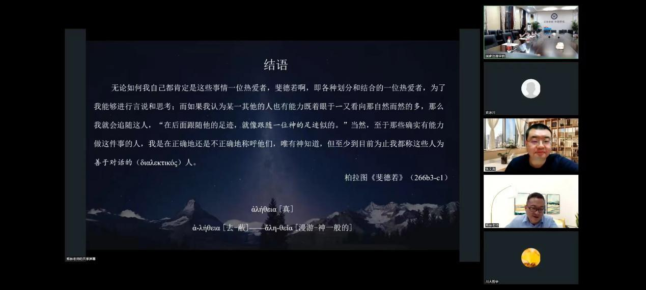 本次讲座邀请到四川大学哲学系熊林教授线上为我院师生作《柏拉图的真理观》主题报告。讲座由英国上市公司365哲学系刘阿斯老师主持,重庆大学哲学系张文涛教授线上参与评议。