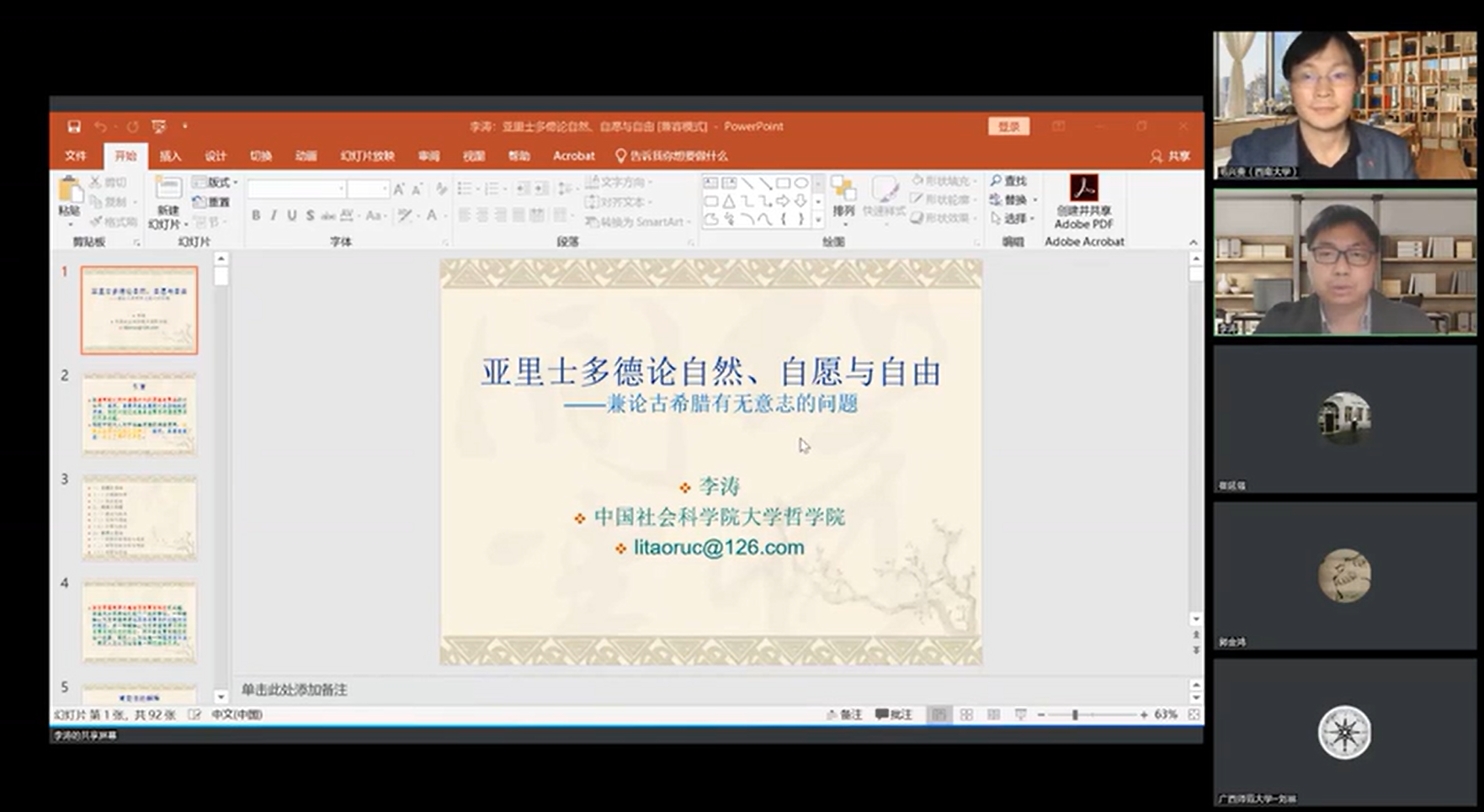 本次讲座邀请到中国社会科学院大学哲学院李涛副教授线上为师生做题为《亚里士多德论自然、自愿与自由——兼论古希腊有无意志的问题》的学术报告。讲座由英国上市公司365国家治理学院哲学系毛兴贵教授主持,英国上市公司365副校长崔延强教授担任评论人。通过“腾讯会议”和bilibili平台共有来自全国高校的160余名师生参加本次讲座。