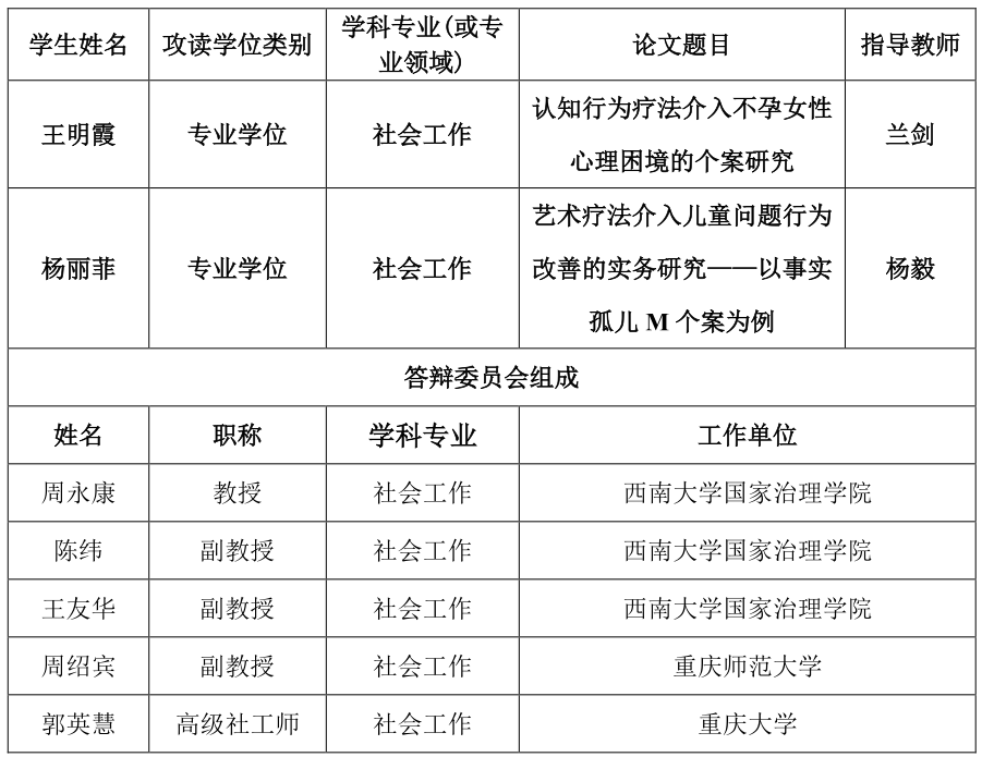 国家治理学院社会工作专业2022年秋季学期学位答辩安排公告