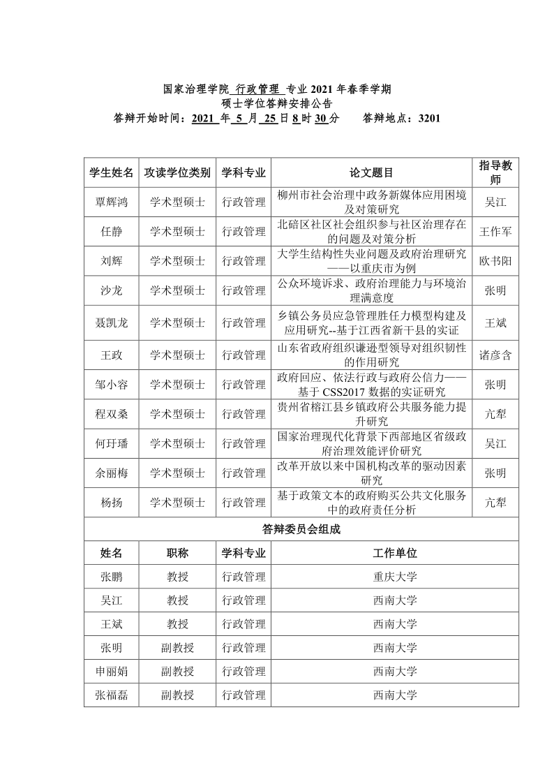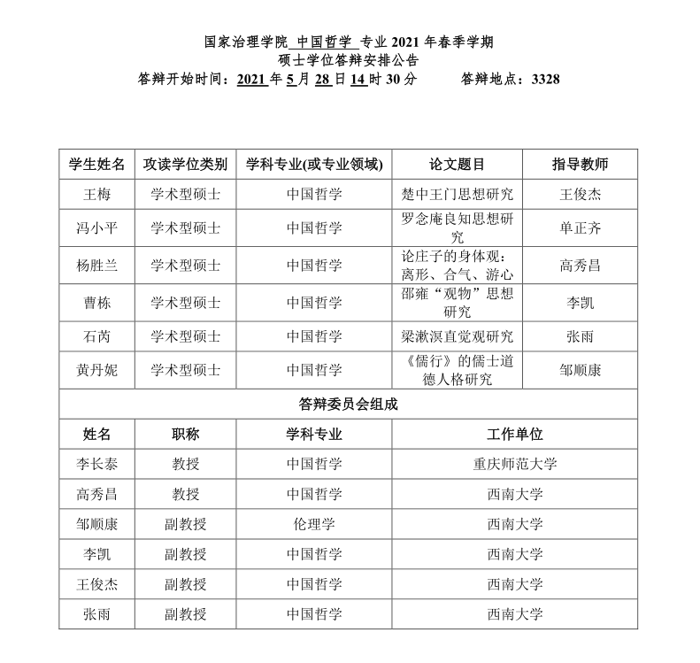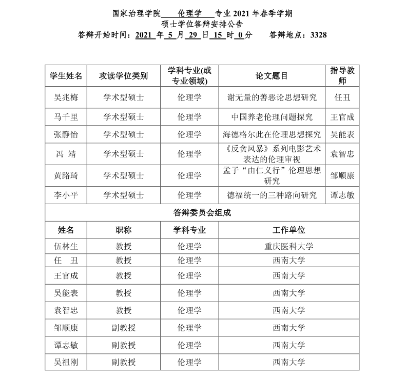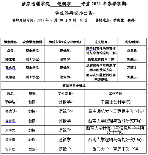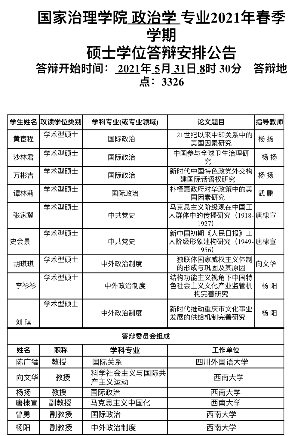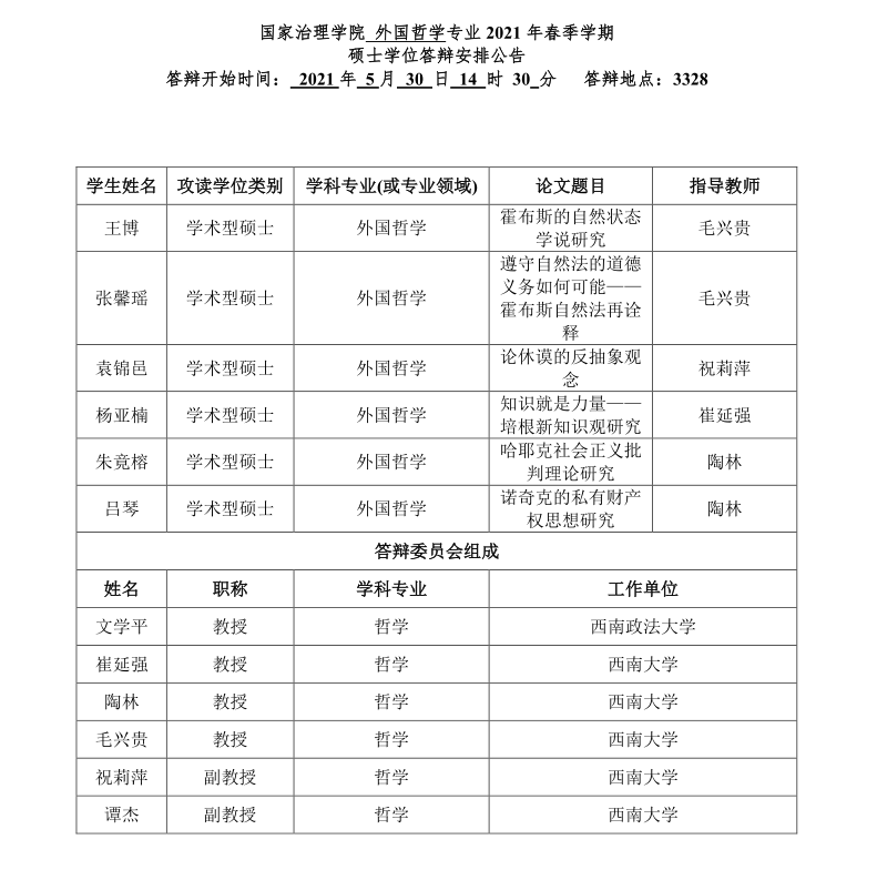 国家治理学院 2021年春季学期全日制研究生学位答辩安排公告