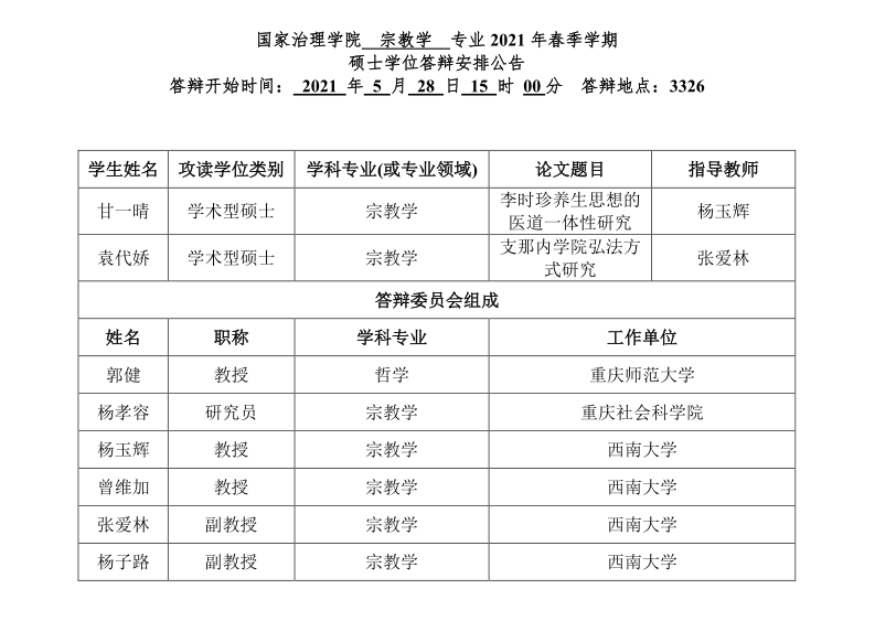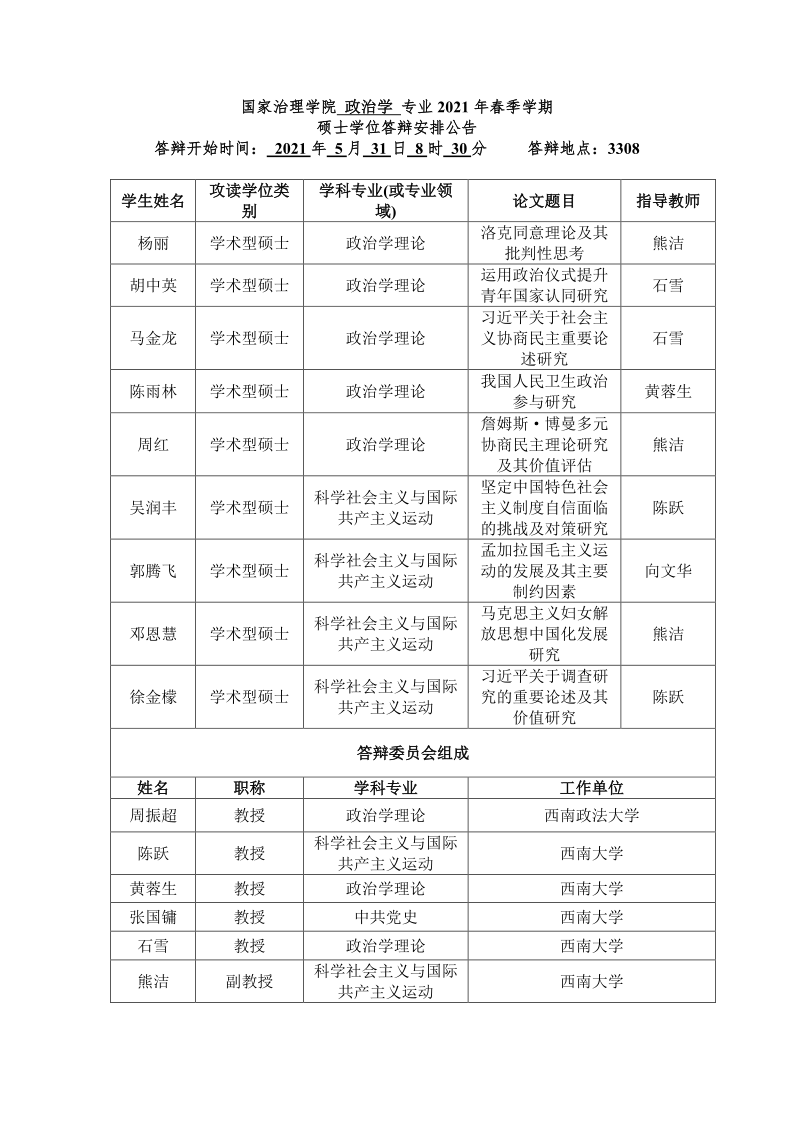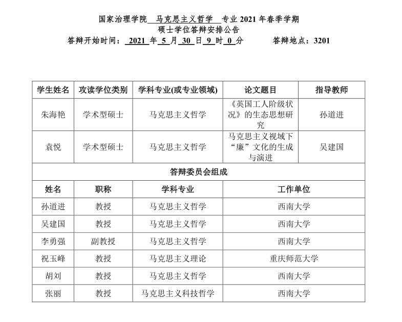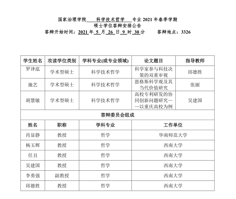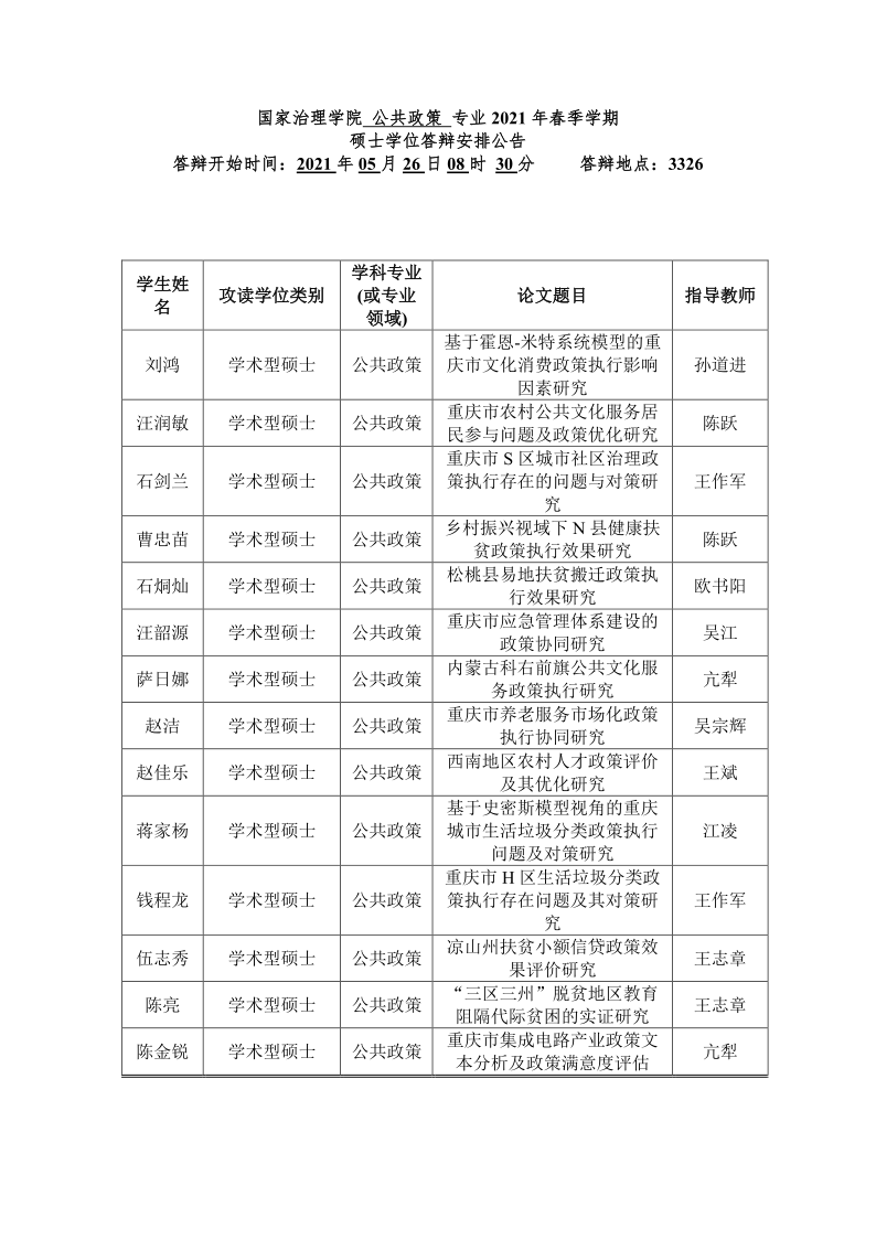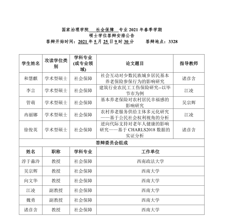 国家治理学院 2021年春季学期全日制研究生学位答辩安排公告