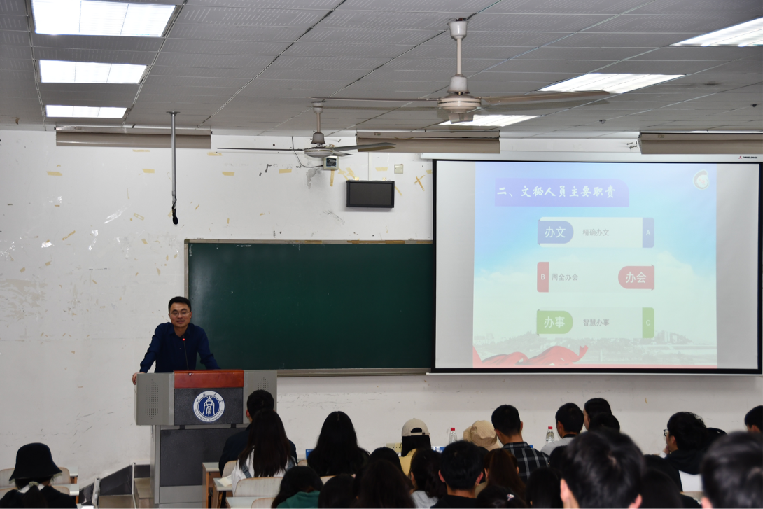 王加维主任首先以“如何做好文秘工作?”这个问题为切入点与在场的同学们积极互动,围绕机关的主要任务——办文办会办事开展讲授。王主任结合多年的工作经验,着重向在座的同学们讲解了文秘工作的涵义,文秘工作的特点和工作要求。接着,王主任深入浅出、生动形象地从公文概述、公文格式规范、公文写作要求及其他文稿写作四个方面进行了详细的培训讲解,并结合实际案例生动剖析了公文写作中常见的错误。他强调,公文写作能力是一名优秀机关干部的必备能力,要培养学习积累的习惯,要勇于承担公文写作任务,通过实践进一步提高自身公文写作水平。最后,主任分享三点心得体会:定好位、敬好业、修好身。他希望同学们不管以后从事在什么职业、在何种单位,都要不断提升自我能力,实现自我价值,成为国家栋梁之才。