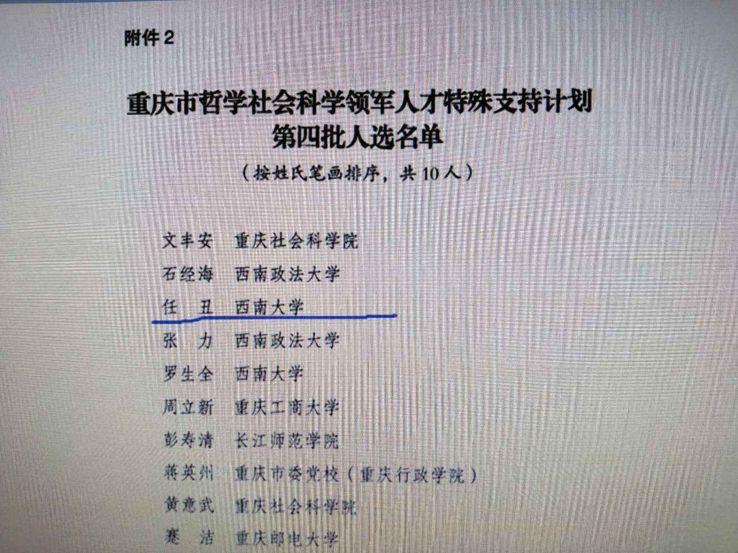 2018年12月27日,中共重庆市委组织部发布《中共重庆市委组织部关于印发重庆市高层次人才特殊支持计划第四批人选名单的通知》(渝委组﹝2018﹞187号),我系哲学一级学科负责人任丑教授成功入选“重庆市哲学社会科学领军人才特殊支持计划第四批人选”。这是我院2018年大力推进哲学学科建设的又一成绩。