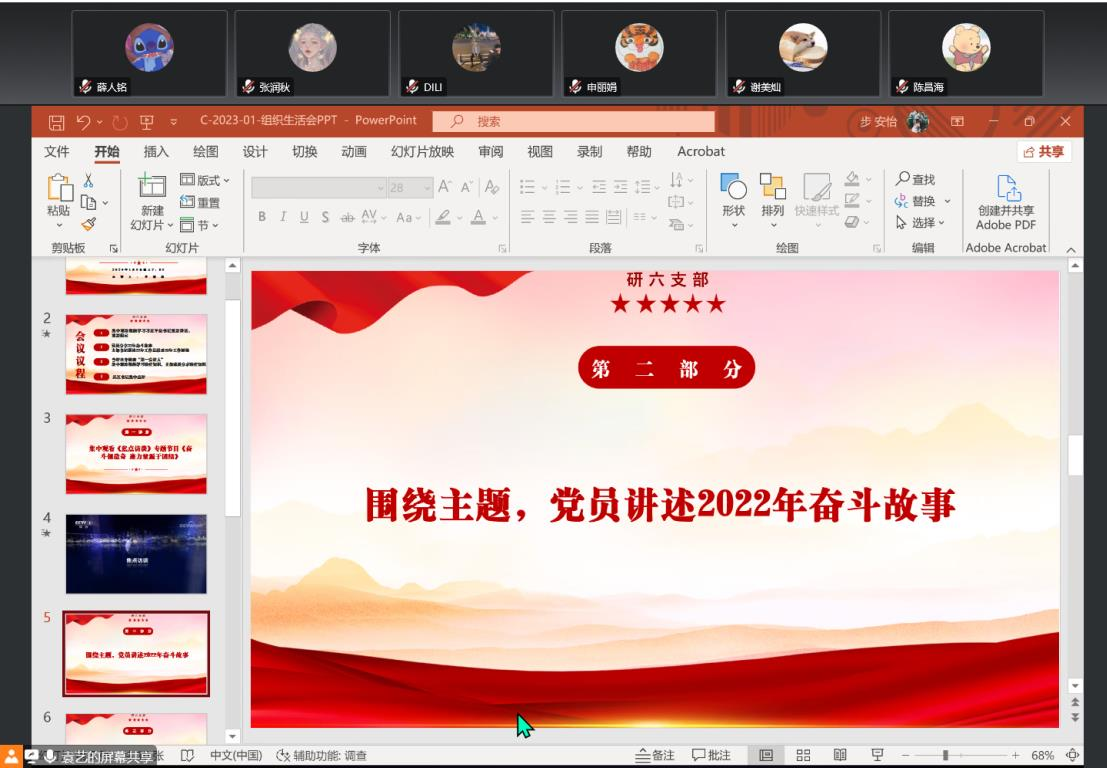回首过往,步履坚实。支部全体成员围绕主题,逐一分享自己2022年的奋斗故事。王晨同学谈到,从考研备战到正式成为一名研究生,这里有过焦虑、迷茫和痛苦但不曾放弃,这种经过持续投入和坚持所得到的收获比轻易获得的更有分量。李秋睿同学谈到,乡村振兴评估调研是其记忆最深刻的奋斗故事,其在评估实践中深入理解了理论知识,在团队分工中感悟到团结奋斗的意义。