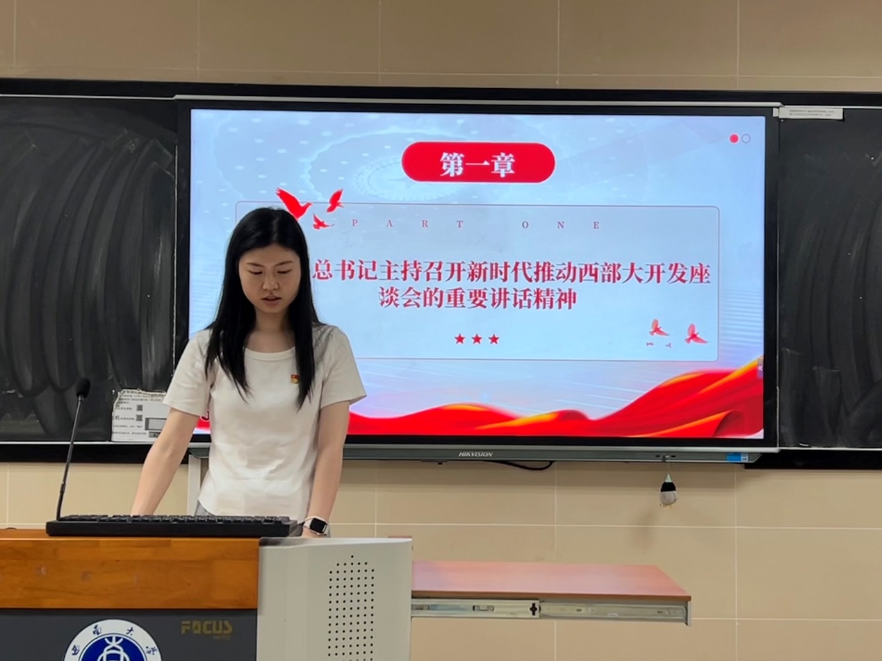 在第一议题学习环节,研究生第六党支部徐婷、王晨同志先后领学习近平总书记对新时代青年寄语、习近平总书记主持召开新时代推动西部大开发座谈会的重要讲话精神和习近平总书记在重庆考察时的重要讲话精神。在专题学习环节,石燕玲同志领学重庆市委书记袁家军来校调研并主持召开青年代表座谈会的讲话精神。理论学习强化了党员同志的政治意识,激发了新时代青年勇于创新,敢于拼搏,在推进强国建设、民族复兴伟业中勇做排头兵的青春激情。