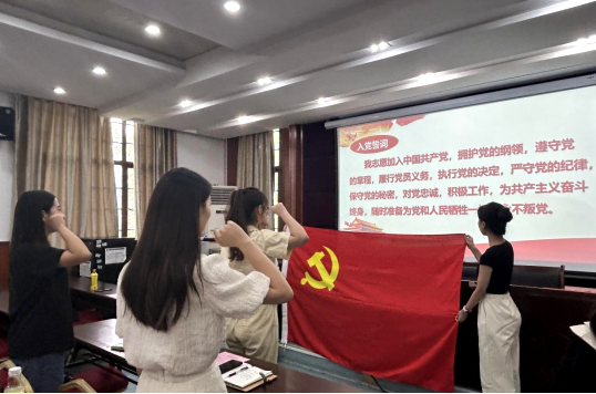 随后,研究生第八党支部书记曾琪芮与新闻与传播(专硕)第一党支部书记冯琳分别为陈裕涵、郭昌鑫、肖鳗、李远婕四位同志赠送政治生日贺卡,在支部书记的带领下,党员们庄严向党旗宣誓并重温入党誓词、重忆入党初心。