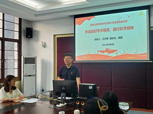 发布时间: 2023-06-12 08:57:07 已阅读:深入学习贯彻习近平新时代中国特色社会主义思想,6月8日晚,学校社会科学处副处长王作军教授于3教3328会议室为国家治理学院研究生第六党支部讲授题为《养成良好学术规范,践行科学精神》的专题党课。研六支部全体成员参加学习,活动由支部书记申丽娟主持。