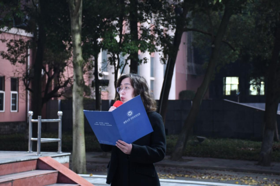 春寒料峭,晨曦初现。清晨6时50分,全体同学已整齐地站立在大礼堂旁的国旗台广场等候,怀着激动的心情翘首以待升旗仪式的开始。6时55分,英姿飒爽的女子国旗班成员们护送着鲜艳的五星红旗入场,铿锵有力的正步足音激荡在同学们耳畔。7时整,升旗手、学院2020级何晏涵同学右臂一扬,鲜艳的五星红旗伴随庄严的《中华人民共和国国歌》缓缓升起,全体师生怀着激动的心情齐唱国歌,向着迎风飘扬的五星红旗行注目礼。