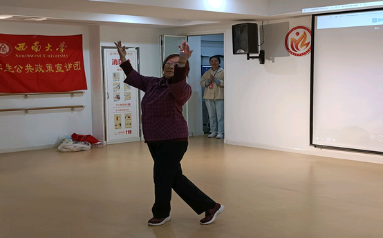 首先,公宣团成员郭桂容、王薇亲切地向爷爷奶奶们科普了霜降寓意,以弘扬二十四节气的相关精神文化。接着,志愿者王诗语和孟芯禾上台教授爷爷奶奶们养生操的基础动作并邀请了一名爷爷做示范,场下的志愿者们也热心协助爷爷奶奶们的学习,每一节动作,爷爷奶奶们都学得十分的认真。