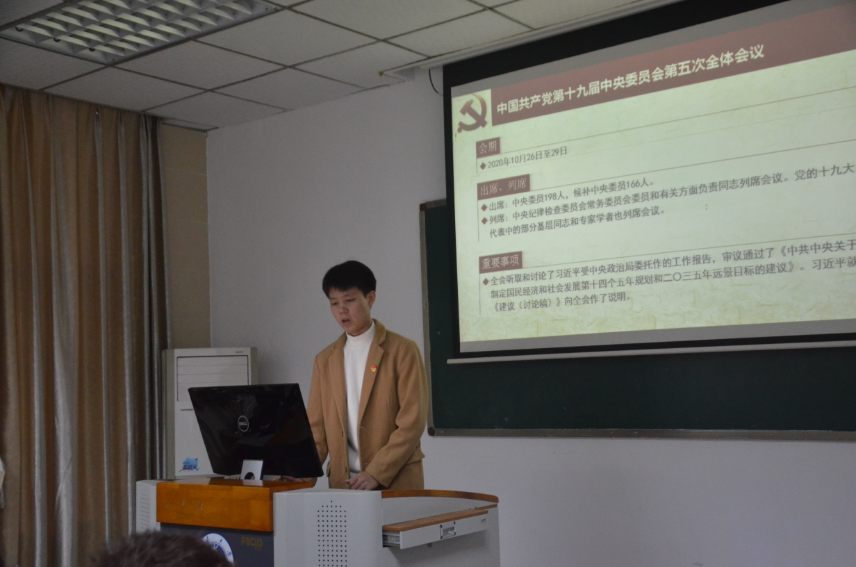 会议伊始,李泓桥同学从“决胜全面建成小康社会取得的十方面决定性成就”、“到二〇三五年要实现的九方面远景目标”、“‘十四五’经济社会发展主要目标”及“实现奋斗目标的十二方面具体举措”四个维度带领与会人员共同学习了党的十九届五中全会会议公报,并对第四次“校团代会”的相关工作进行了说明。