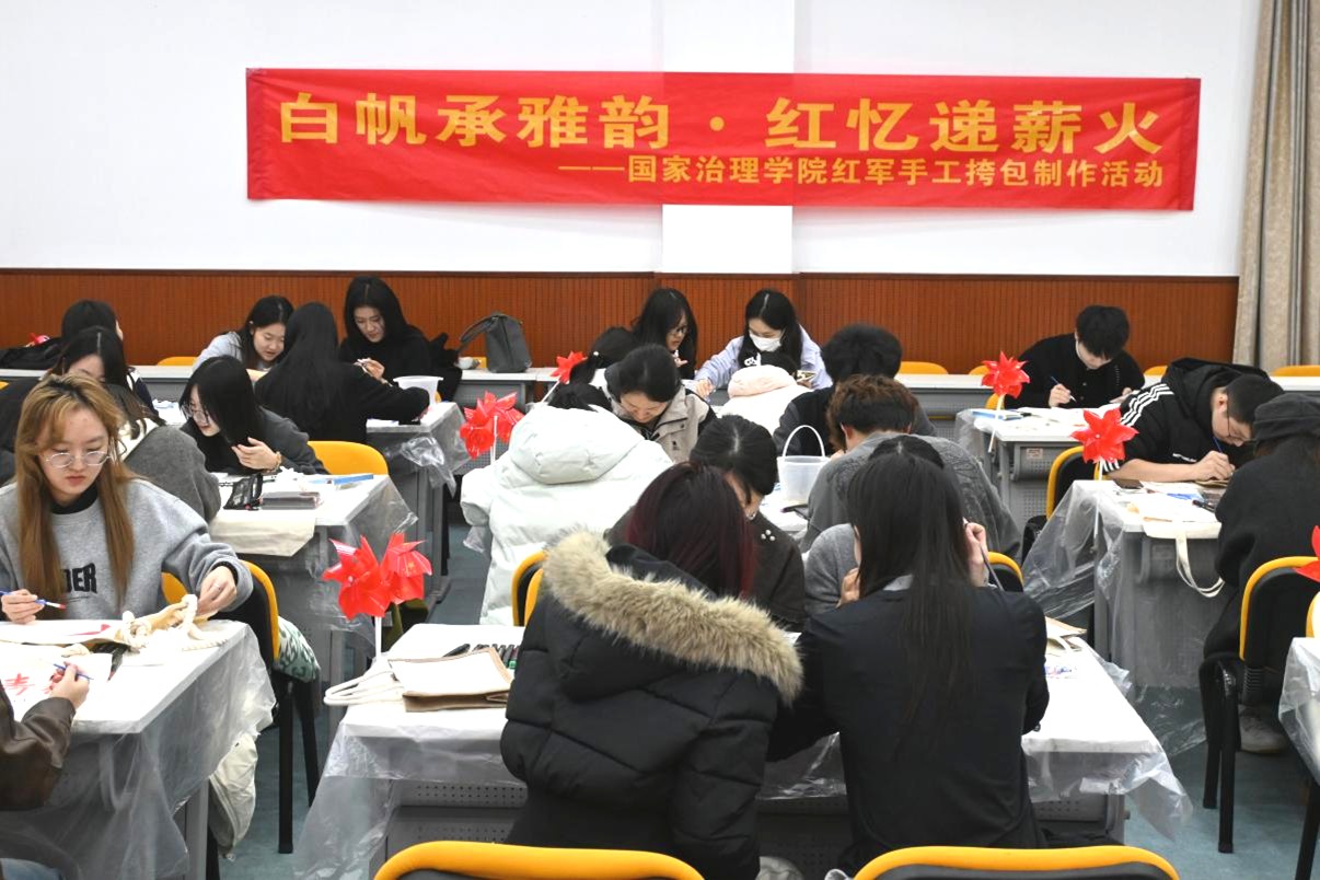 为深入贯彻落实《教育部办公厅等四部门关于开展全国高校“传承红色基因、学思践悟中国共产党人精神谱系”宣传教育的通知》要求,2025年12月5日,国家治理学院“白帆承雅韵·红忆递薪火”红军挎包制作活动在绩镛楼3308教室顺利举办。此次活动由学院研究生会主办,吸引了来自12个学院的研究生积极参与,通过动手实践来触碰红色历史,深化对红色文化的理解,进一步凝聚青年学子的认同感。