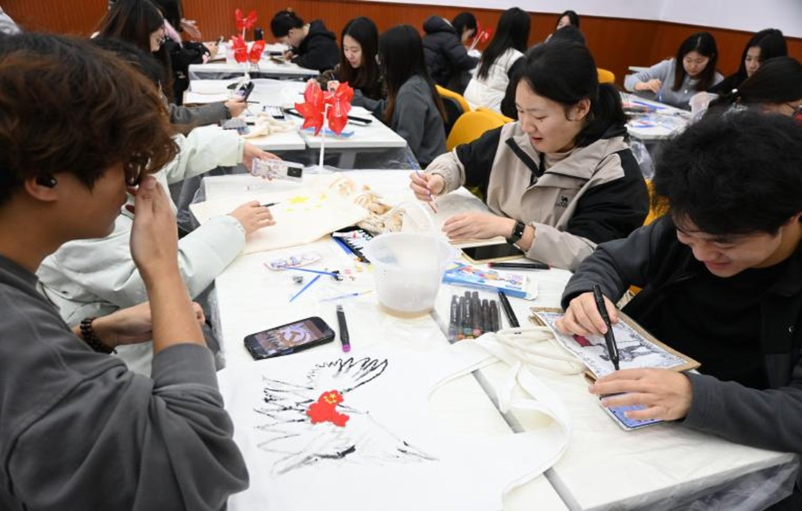 创作环节中,同学们纷纷沉浸式投入创作,以五角星、长征路线、天安门等红色元素为核心,或融入民族团结理念,或书写时代初心,将红色记忆与家国情怀凝于笔端。分享环节,有同学感慨:“每一笔都恰似与历史对话,这只挎包的两面,一面承载着革命军人的坚守与奉献,另一面则诠释了这份坚守所换来的万家平安、岁月静好。”