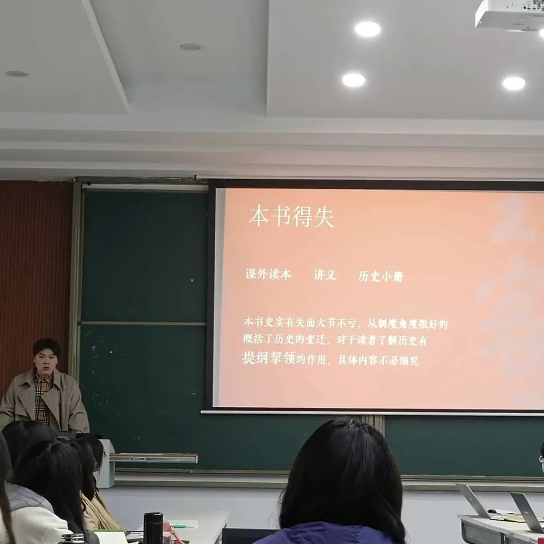 在读书分享环节,21级公共管理类8班的张伟靖同学和李佳恩同学分别以宋朝和明朝制度为例,通过中西方历史文化对比分析了中国古代君主专制中央集权制度;20级行政管理2班的何傲同学和胡哲浩同学依次分析了中国古代中央与地方关系和政治制度观;21级研究生李文琢同学进行了以“鉴于往事,资于治道”为题的读书分享,并与现场的同学们进行了讨论。最后,21级研究生陈倩同学从考试制度出发以小见大,分析了古今中外考试制度的利弊。
