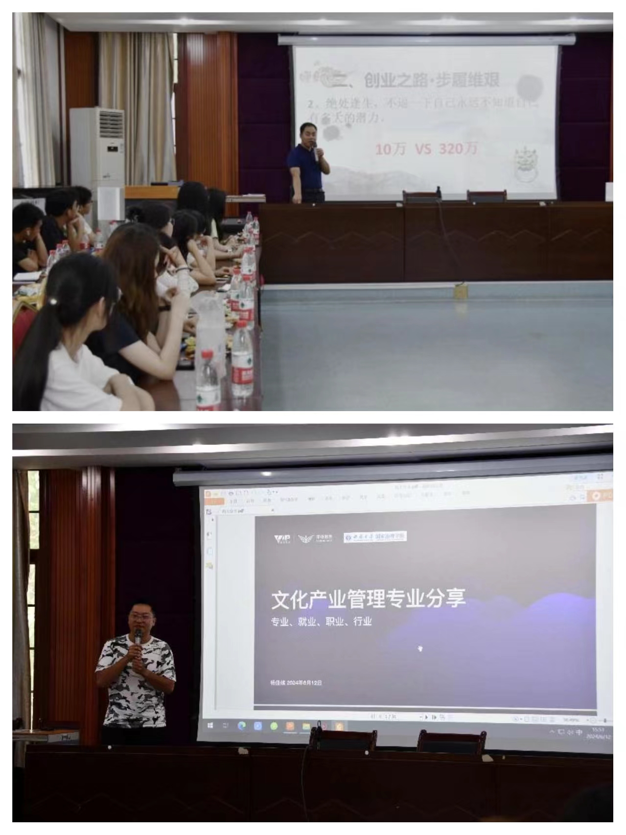 发布时间: 2024-06-14 15:52:00 已阅读:为了发挥优秀校友的榜样领航作用,让文化产业管理专业学生全面了解专业发展前景和就业方向,引导学生早日做好职业规划,6月12日下午,学院邀请到两位优秀校友刘向峰与杨佳续做“榜样领航,助力成长——文化产业管理专业优秀校友经验分享会”。本次分享会由专业负责人张海燕主持,学院党委书记刘勇、副院长张永红、班主任熊婉彤、辅导员史丽以及2023级、2022级文化产业管理专业学生参加。