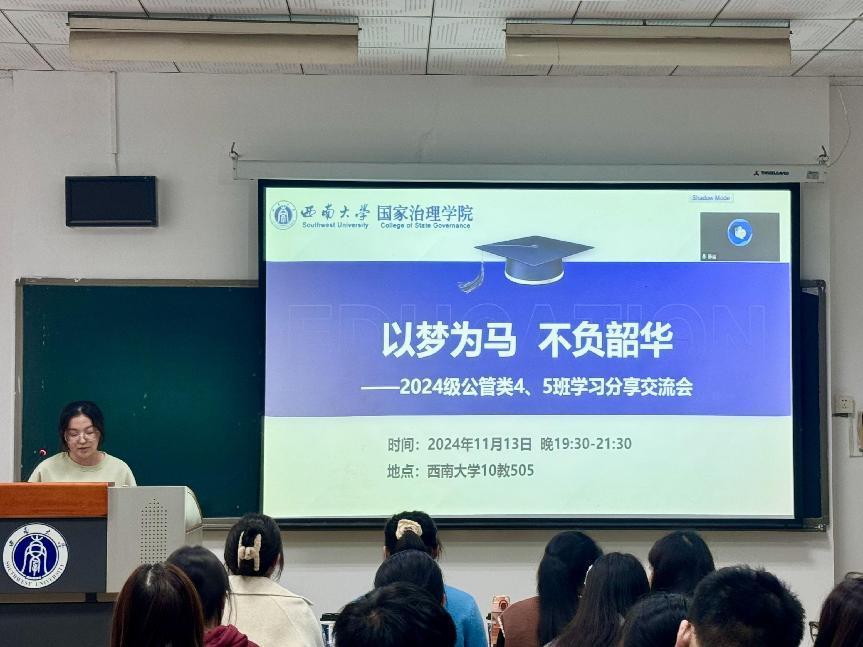 发布时间: 2024-11-14 15:02:09 已阅读:为进一步加强学风建设,发挥朋辈帮扶引领作用,帮助新生更好地适应大学生活,营造良好学习氛围,明确学习目标,11月13日19:30,2024级公共管理类4班和5班在10教505举办以“以梦为马 不负韶华”为主题的学习分享交流主题班会,班主任曾莉、辅导员肖颜以及全体同学参加活动。