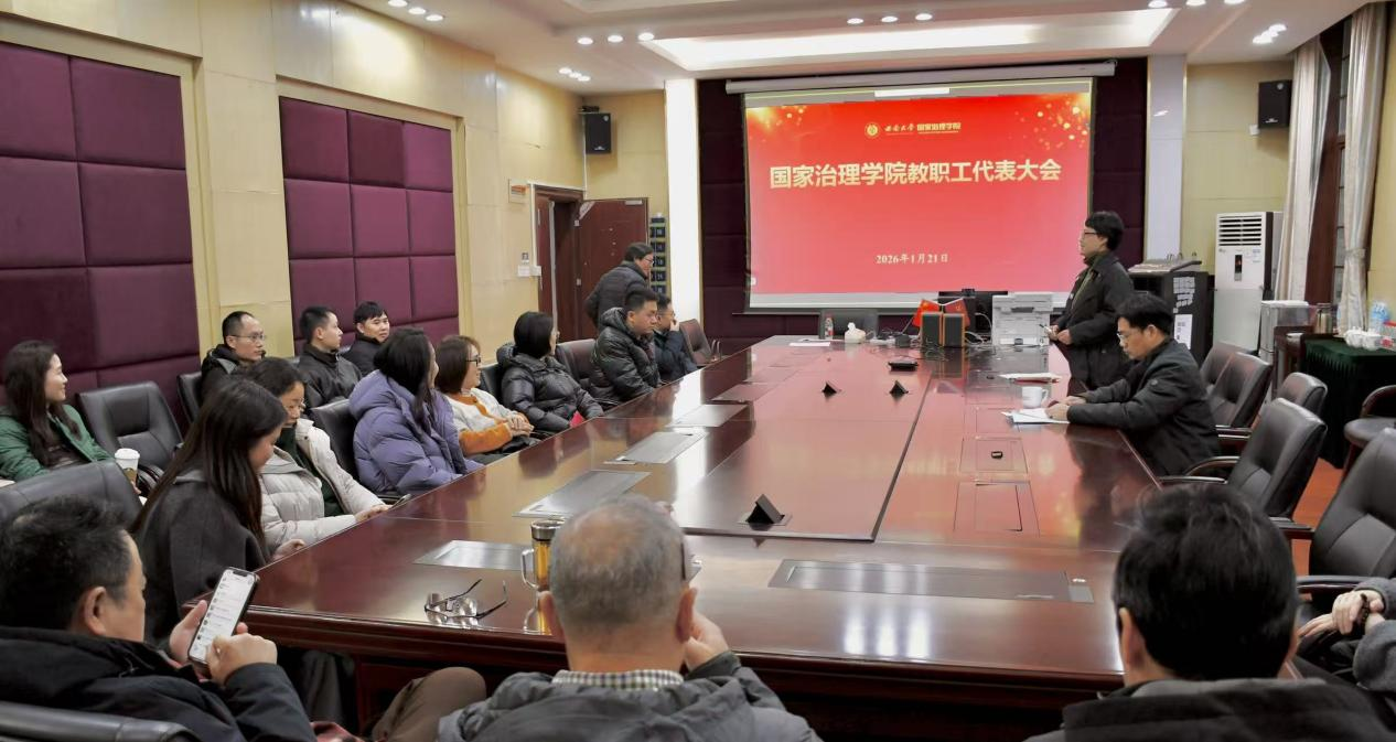 2026年1月21日下午,国家治理学院召开教职工代表大会。大会增选了国家治理学院第一届教职工代表大会代表6人;大会审议并通过了《国家治理学院绩效工资分配细则》。