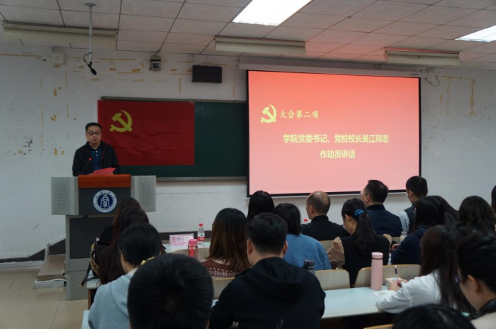 大会在庄严的国歌声中拉开帷幕,全体参会人员面向鲜红的党旗肃立,齐唱国歌。之后,学院党委书记、党校校长吴江为学员们作动员讲话。吴江书记首先代表学院党委,向第1期党校新学员表示热烈的欢迎。他强调:党校是对青年学生进行系统思想教育的有效载体,是对优秀学生进行党的性质、党的纲领、党的宗旨、党的奋斗目标教育的重要阵地。希望各位新学员在本期党校学习中能够做到认真学习,提升素养;志存高远,铸牢信念;主动参与,知行合一。