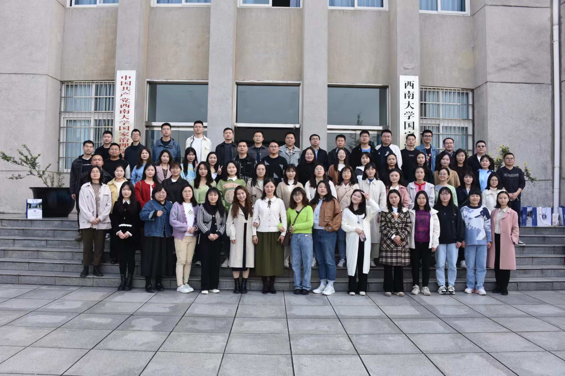 仪式结束后,2021级三个班同学们分别与班主任老师留下了第一张班级合影,师生一起与春天相约,不负韶华,不负西大。随后便分班进行为期两天的第一次线下课程学习。